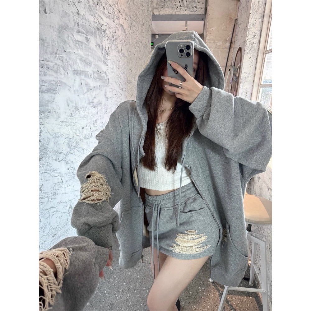 精緻高級穿搭套裝 花灰色鬆弛感復古破洞外套x短裙