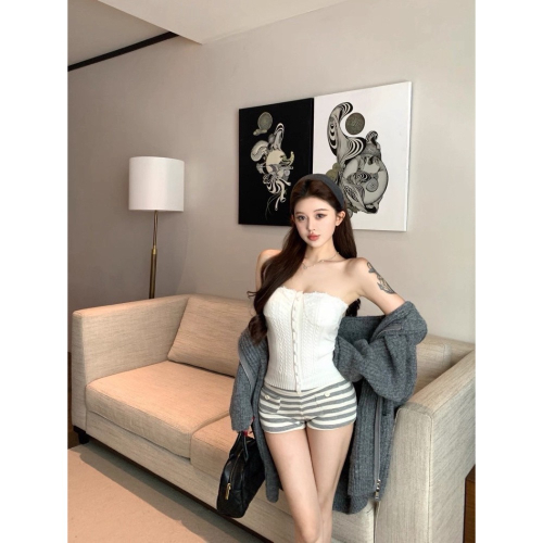 灰感連帽針織外套x鈕扣平口背心x灰白條紋短褲