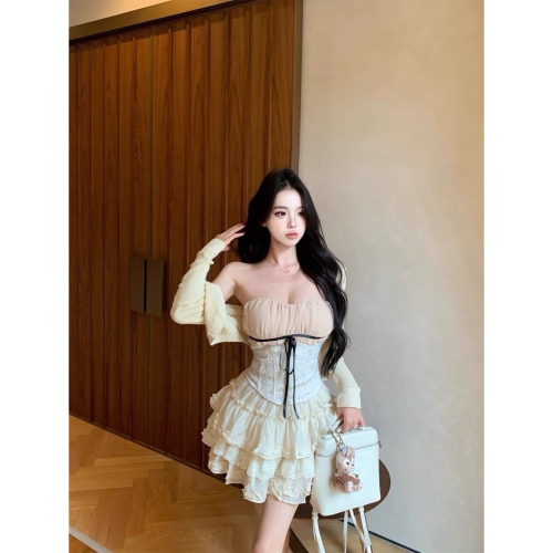奶油夢境蕾絲套裝 外套x平口背心x短裙