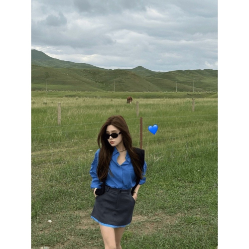 巨好看!韓系配色三件套裝 克萊因藍襯衫x黑披肩x灰藍短裙