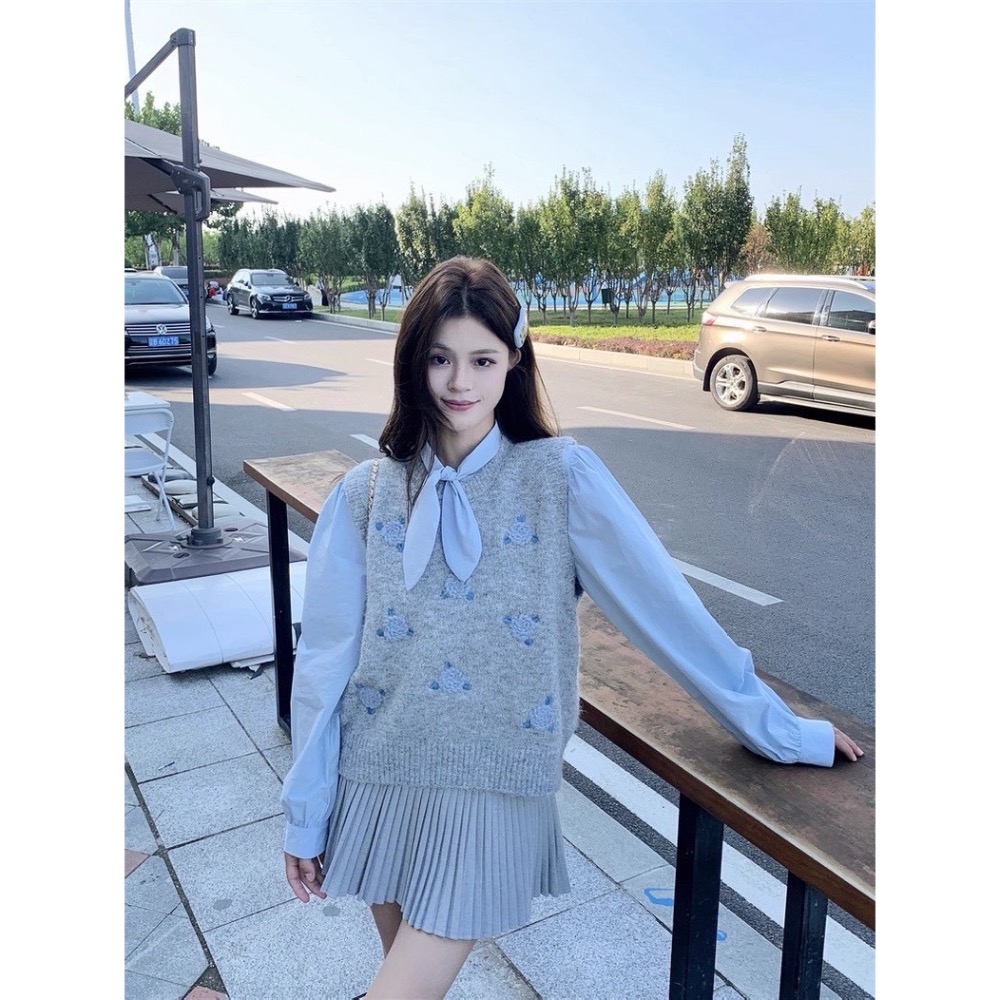 氣質學院風🏫 藍襯衫x藍花朵刺繡毛衣背心x 百褶裙