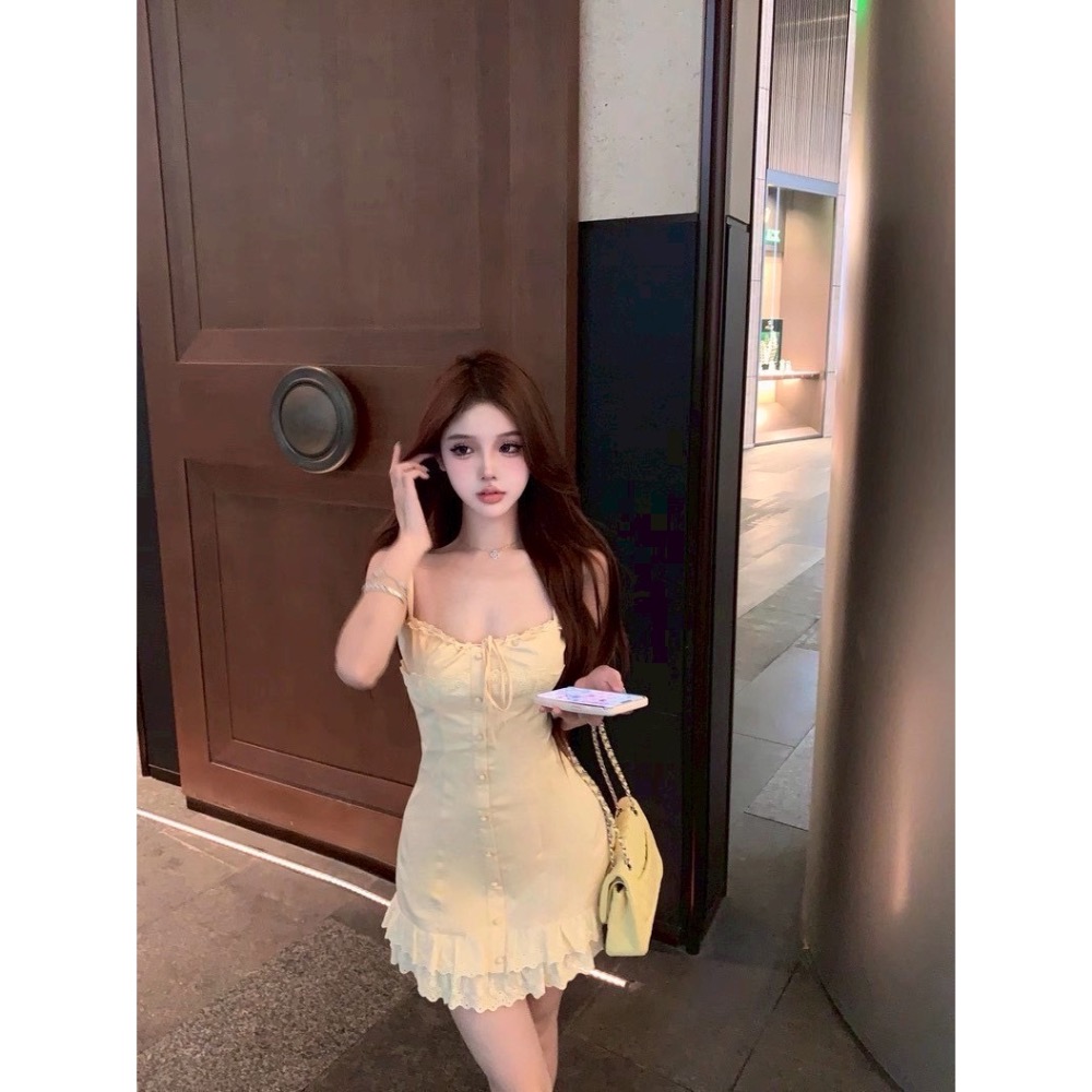 奶黃夢語💛蕾絲雙層花邊連身吊帶裙