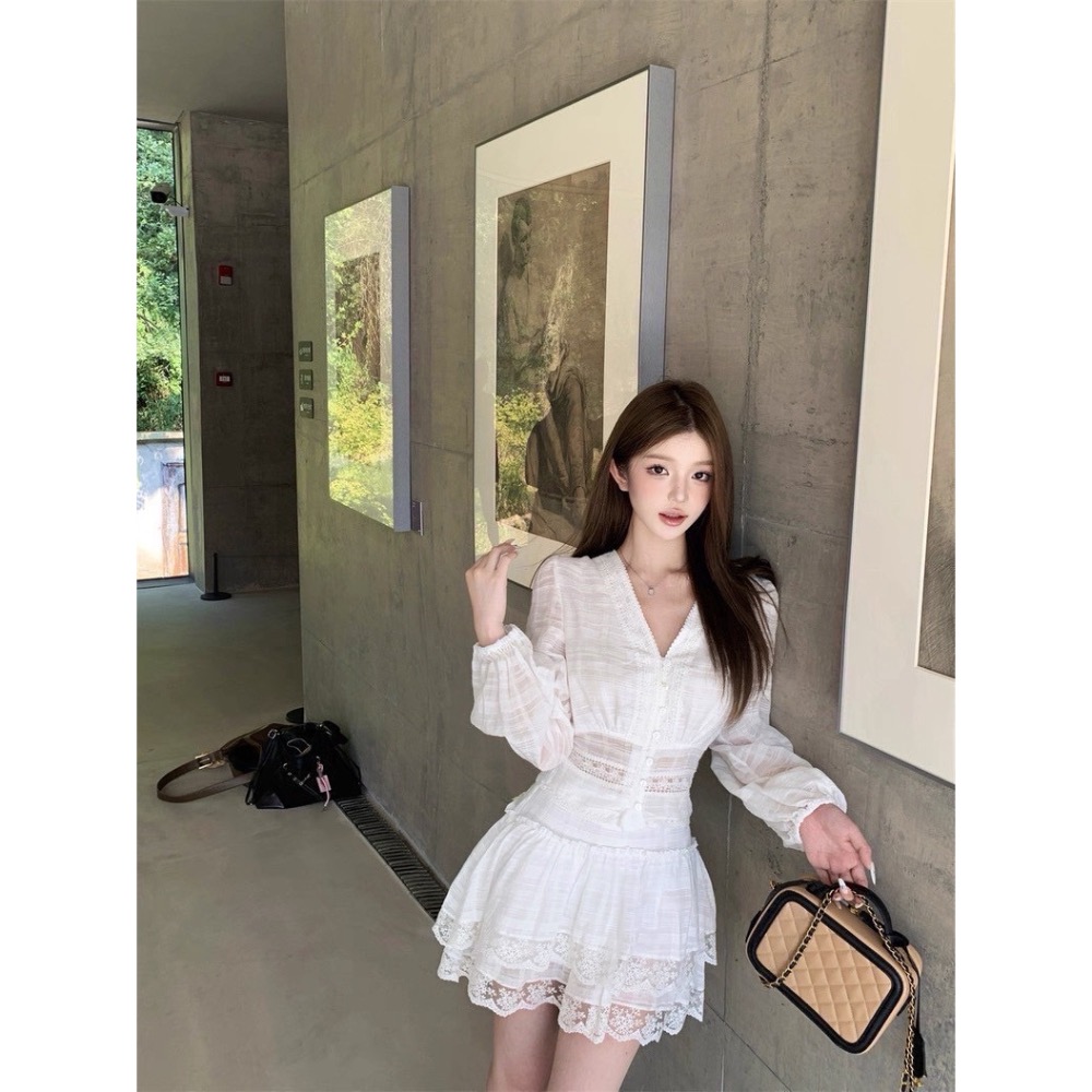 法式白月光☁️ 奶白微透蕾絲上衣x短裙套裝