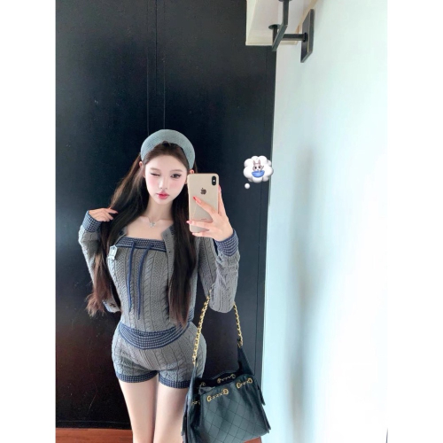 灰調針織學院💭 開衫外套x平口背心x短褲三件套裝