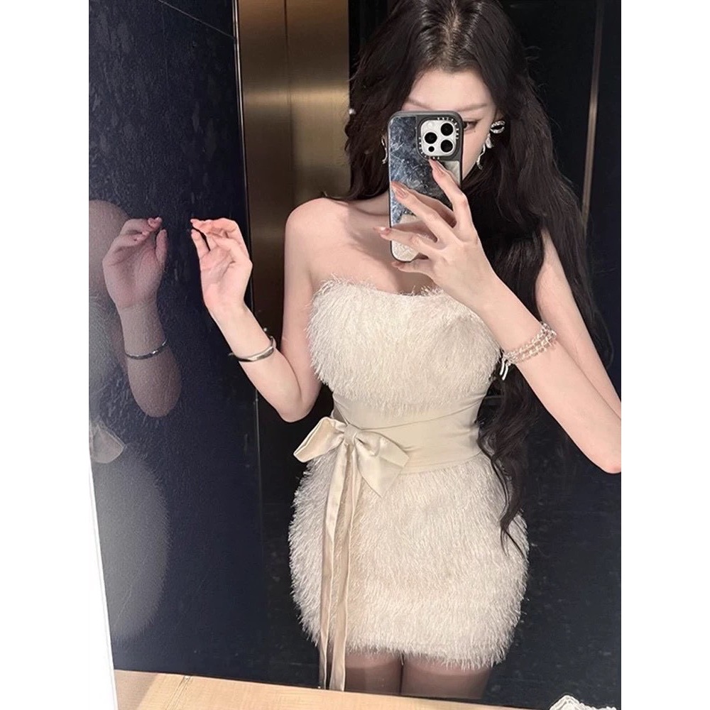晶羽毛絨感綁帶連身洋裝