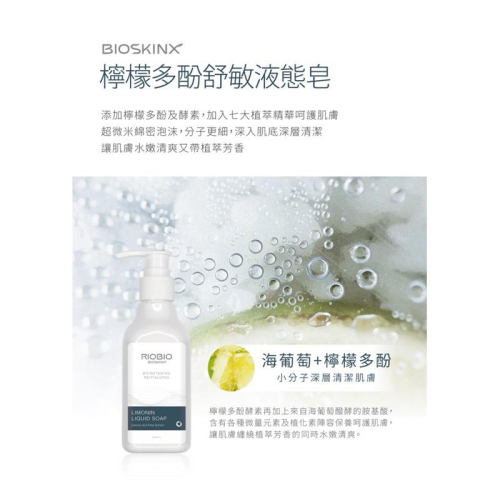 RIOBIO / BIOSKINX 品名:檸檬多酚舒敏液態皂 200mL/瓶 長江生醫&健茂生技 臺灣