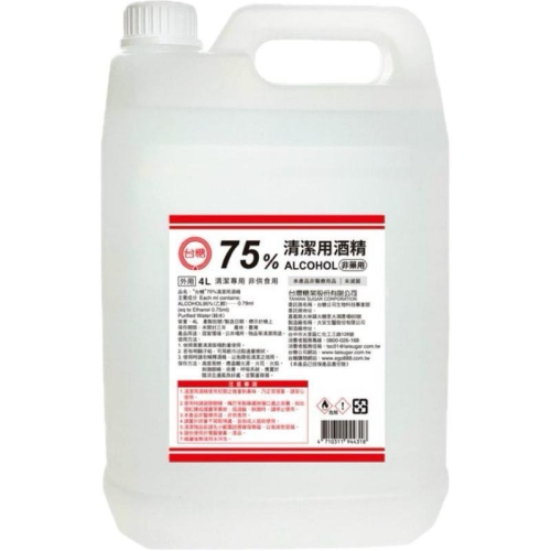 因酒精怕破桶有專用紙箱特製較厚且尺寸量身訂做價格較高,出貨請一定要取貨~未取貨退回外包裝紙箱只能重新換過(重量較重運送來回多少有破損只能丟棄拆解)😂 花很多成本努力保護就是為了能順利送達,如果兩次不取只好列入黑名單,如果產品沒問題👍請五星好評,如有異常麻煩請先告知問題~拜偷拜偷🙂 ‼️‼️如果是急用建議選擇 全家,7-11 https://s-cf-tw.shopeesz.com/file/tw-11134208-7r98q-ls45e8ak1fiq3e 品名:“台糖”75%清潔用酒精。製造日期很新:2023/12 主要成分 Each ml contains: ALCOHOL95%(乙醇) ••••0.79ml (eq to Ethanol 0.75ml) Purified Water(純水) 容量:4L. 貼心小提示=4000ml 產製批號/製造日期:標示於桶上 保存期限:未開封三年 產地:臺灣 產品用途:居家環境、公共場所、物品等清潔用途。 使用方法: 1.依照需要清潔面積酌量使用。 2. 若有明顯汙垢,可用紙巾沾取適量擦拭。 3. 使用時請勿稀釋酒精,以免降低清潔之效用。 保存方法:高度易燃,應遠離火源、火花、火焰。刺激眼睛、皮膚、呼吸系統,應置於陰涼且通風良好處,並緊蓋容器。 本產品非醫療用品/未滅菌 注意事項: 1.清潔用酒精使用初期之微量刺鼻味,乃正常現象,請安心使用。 2.使用時請避開眼睛、嘴巴等黏膜處與傷口處之皮膚,如出現紅腫或搔癢等異狀,或過敏、刺激時,請停止使用。 3.本產品非醫療用途,非供食用。 4.請置於孩童不易取得處,並由成人協助使用。 5.清潔物品前請先小範圍試擦確保無礙,以免掉色受損。 6.請勿使用於電腦螢幕、漆品。 7.噴灑後無須用水沖洗。 台灣糖業股份有限公司 TAIWAN SUGAR CORPORATION 委託商名稱:台糖公司生物科技事業部 委託商地址:嘉義縣大林鎮大糖里大湖農場60號 製造廠名稱:大安生醫股份有限公司 製造廠地址:台中市大里區仁化工三路128號 消費者服務專線:0800-026-168 消費者服務信箱:tsc01@taisugar.com.tw 台糖公司網站:www.taisugar.com.tw 台糖購物網站:www.ego888.com.tw 《本產品已投保產品責任險》