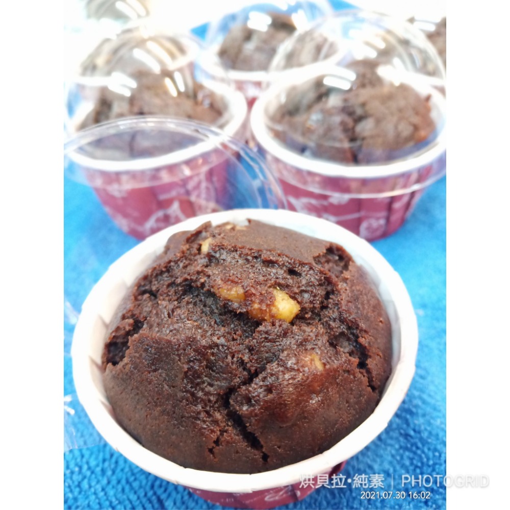 純素巧克力核桃杯糕---獨立杯 成分:無漂白麵粉、水、油、糖、鹽、可可粉、無鋁泡打粉、無調味核桃 保存期限:冷凍狀態30天,或室溫三天食用方式:退冰至常溫即可食用,或者烤箱回烤、氣炸 烘貝拉素食養生麵包館 台南市永康區復國一路455號1樓 0912371378