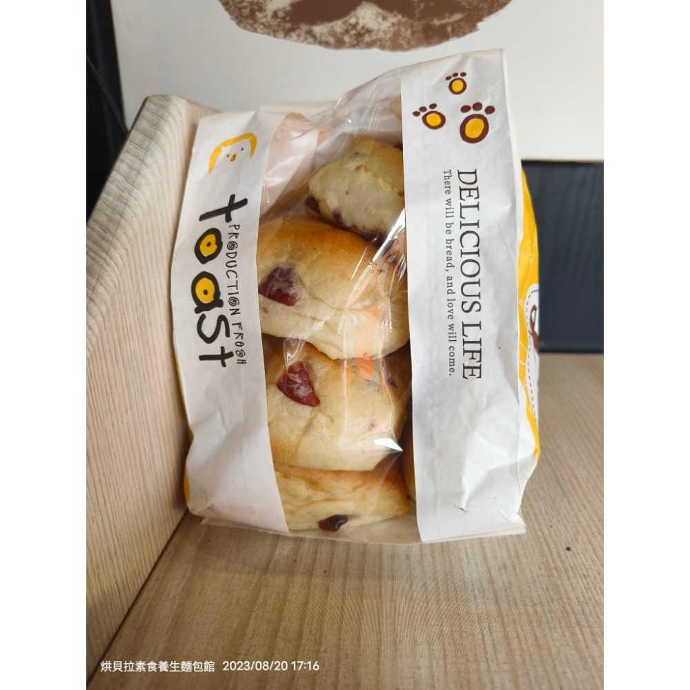 純素蔓素球麵包 成分:無漂白麵粉、水、油、糖、鹽、酵母、蔓越莓乾