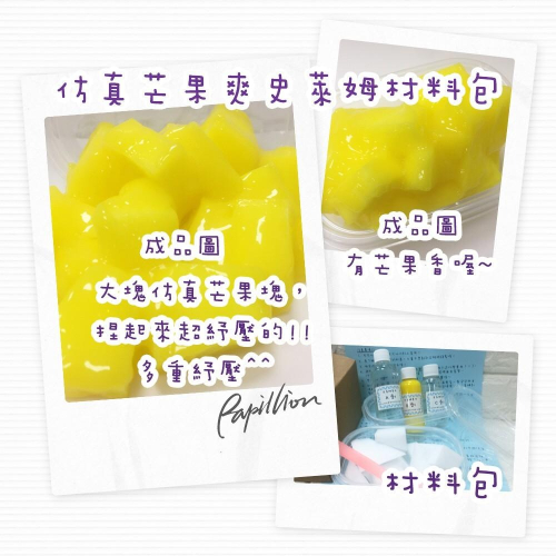 每份材料包可以做出一杯約160ml有芒果香史萊姆,搭配大塊仿真芒果塊,除了搓、壓、拉史萊姆外,還可以捏仿真芒果塊,多重紓壓,超讚的啦~~