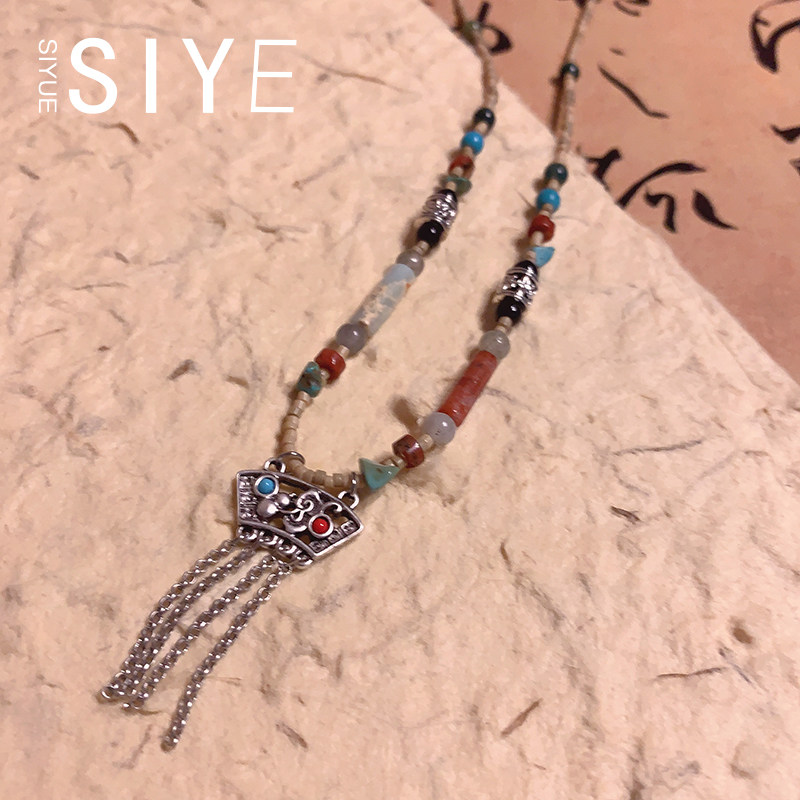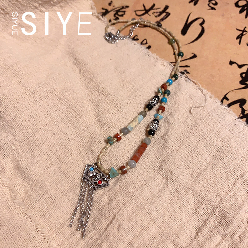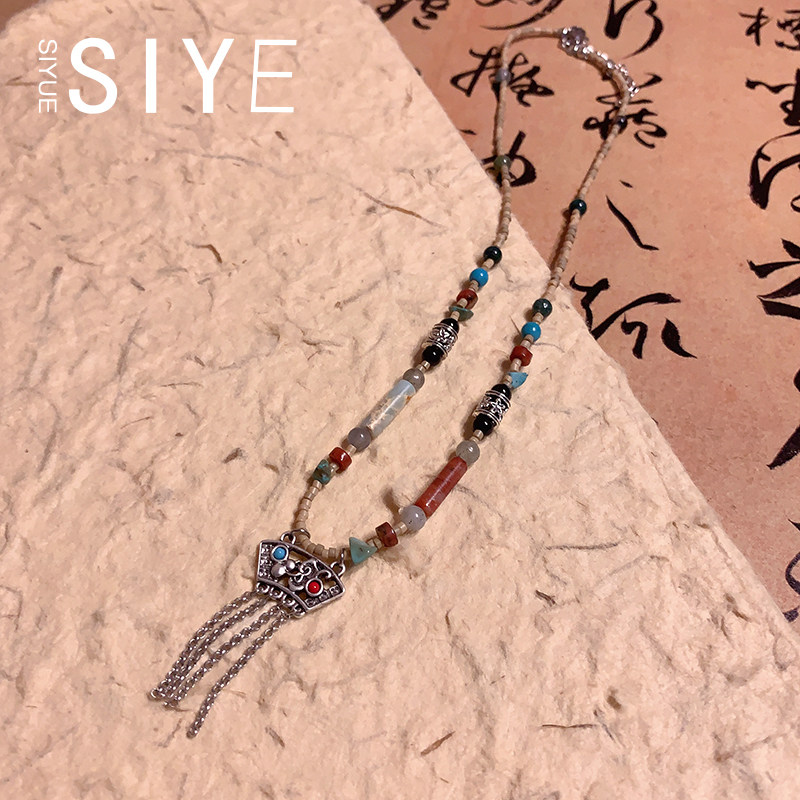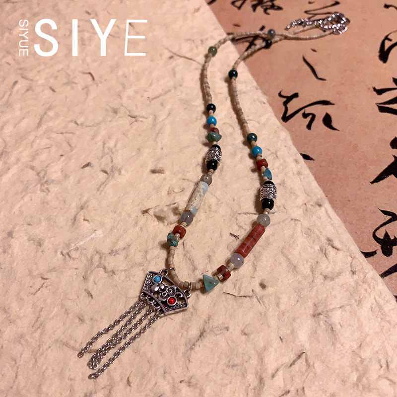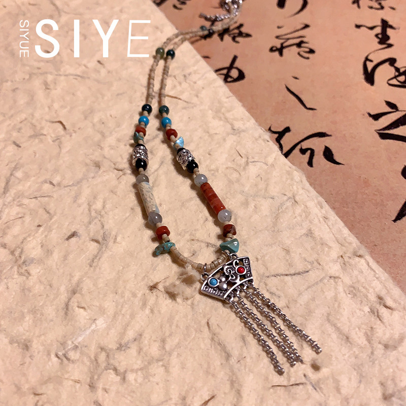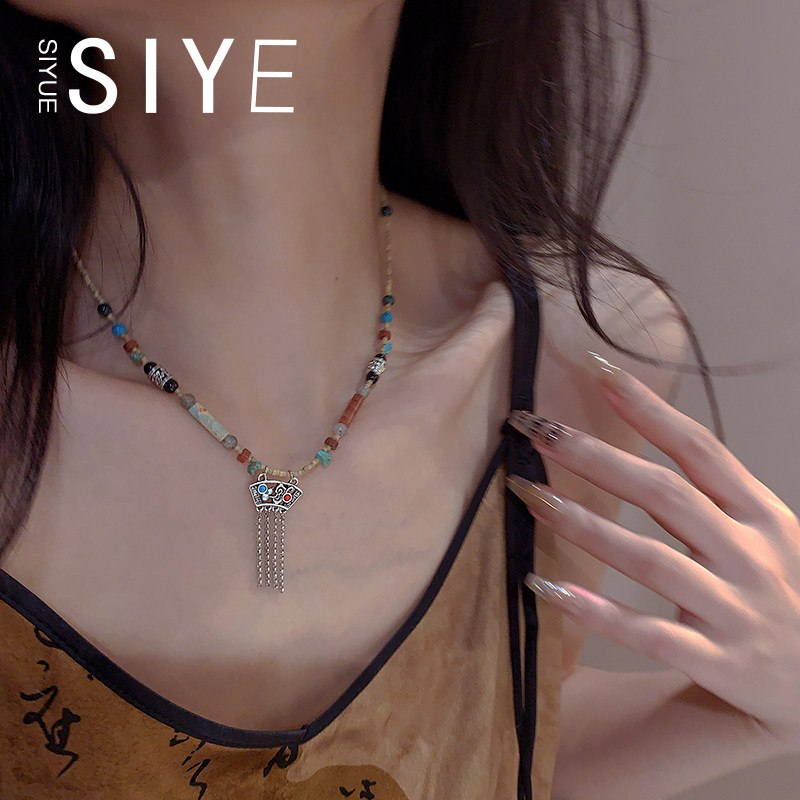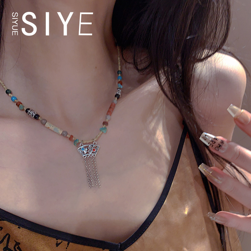 中古風扇子流蘇項鍊新款爆款新中式國潮天然石串珠鎖骨鍊女