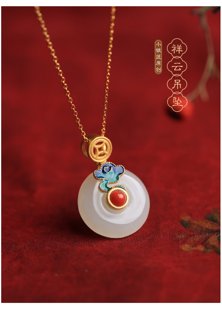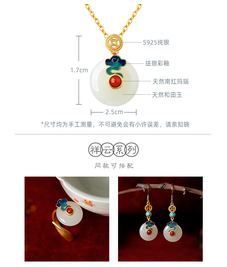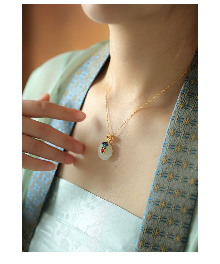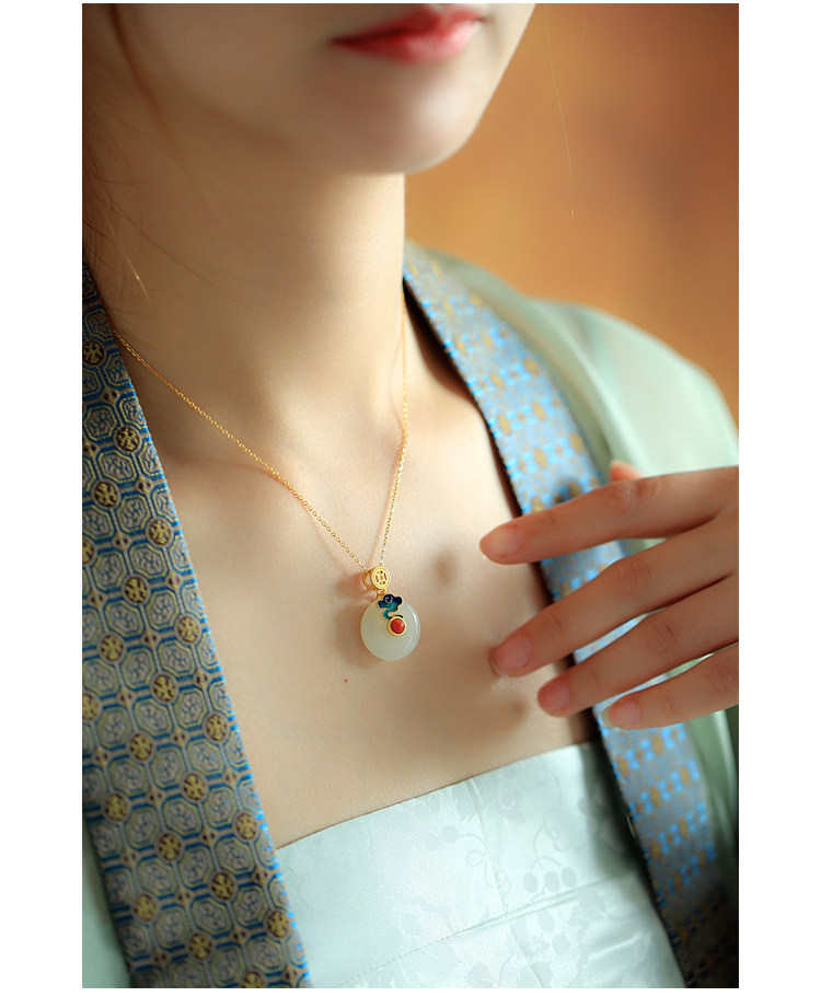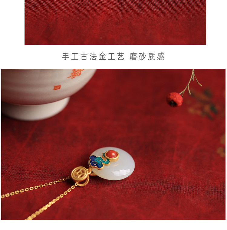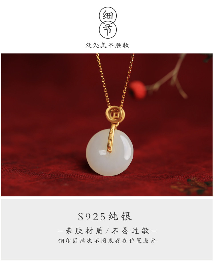 純銀古法金鑲和闐玉國潮玉石平安扣吊墜復古風水晶項鍊女夏