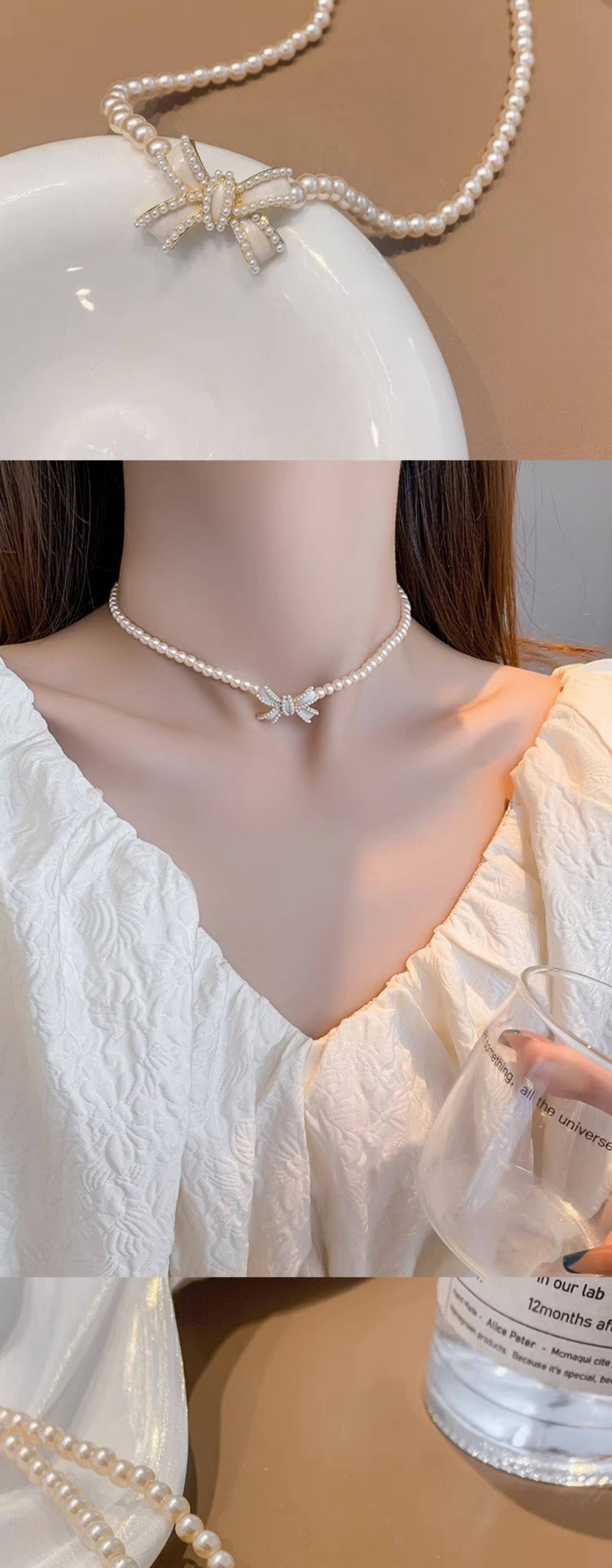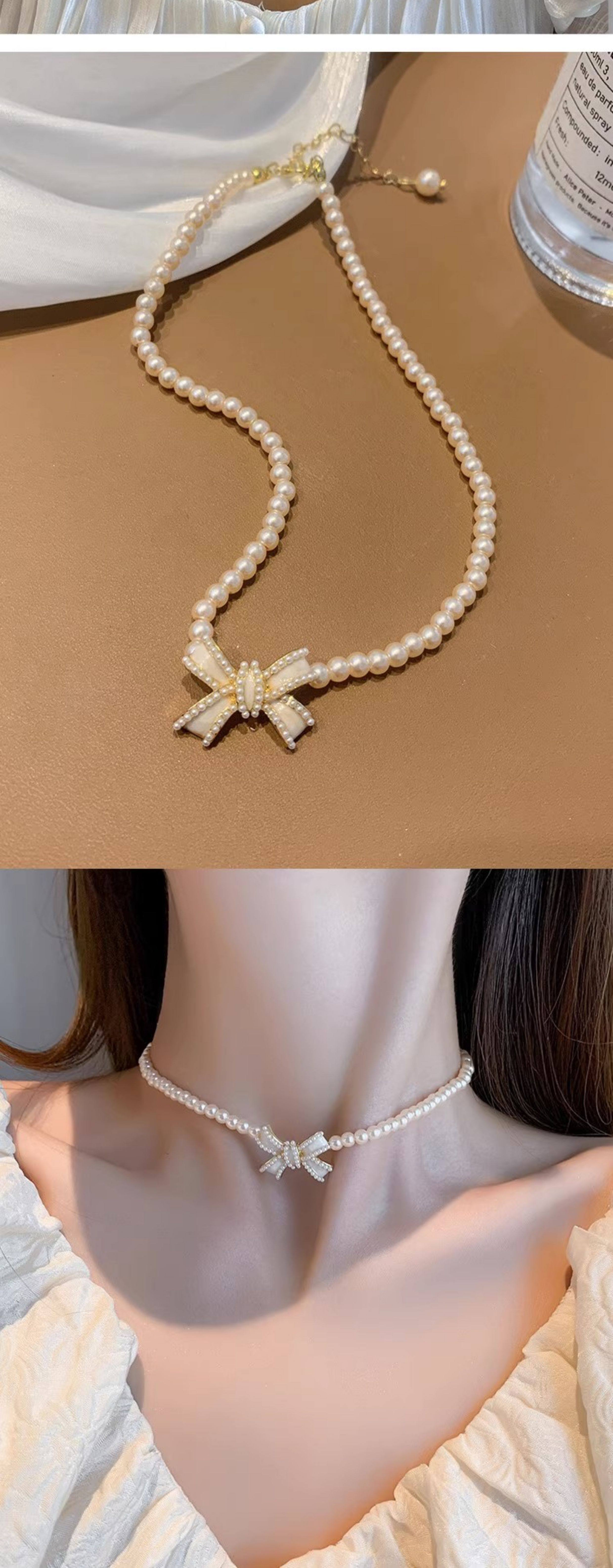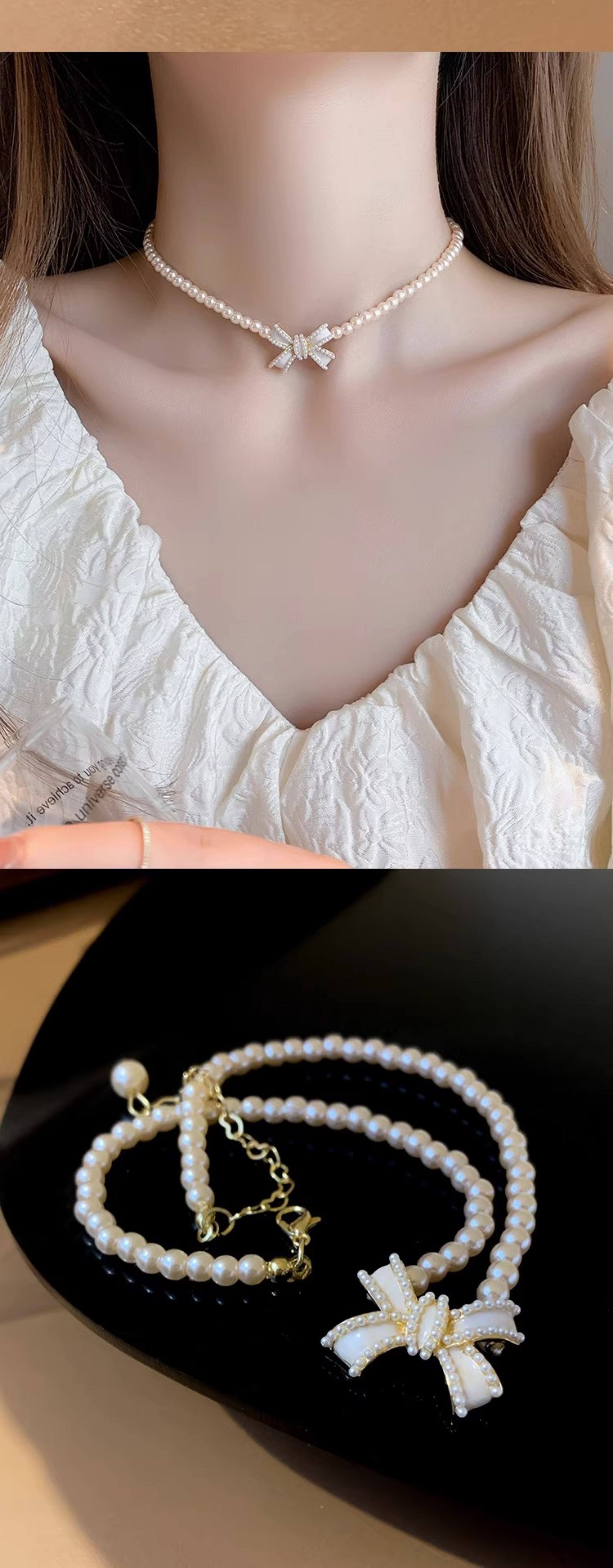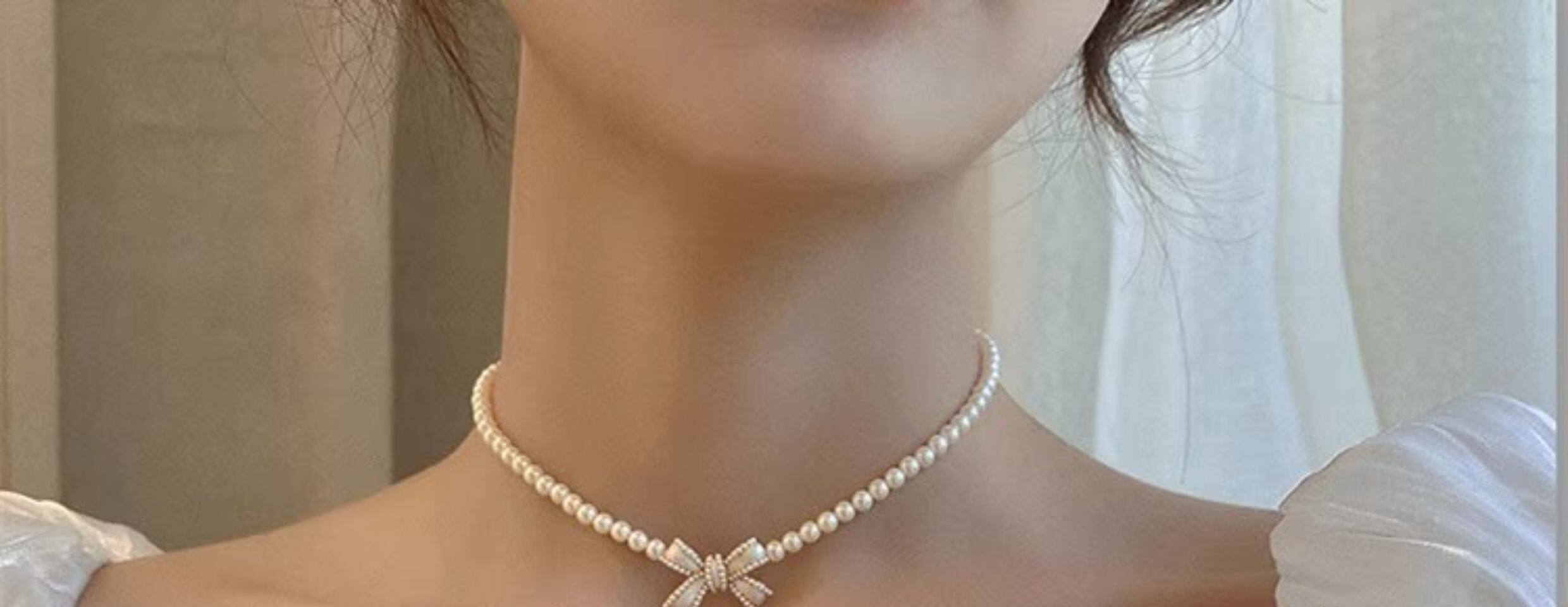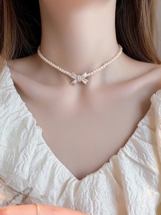 法式優雅珍珠項鍊輕奢簡約氣質短款鎖骨鍊蝴蝶結頸鍊