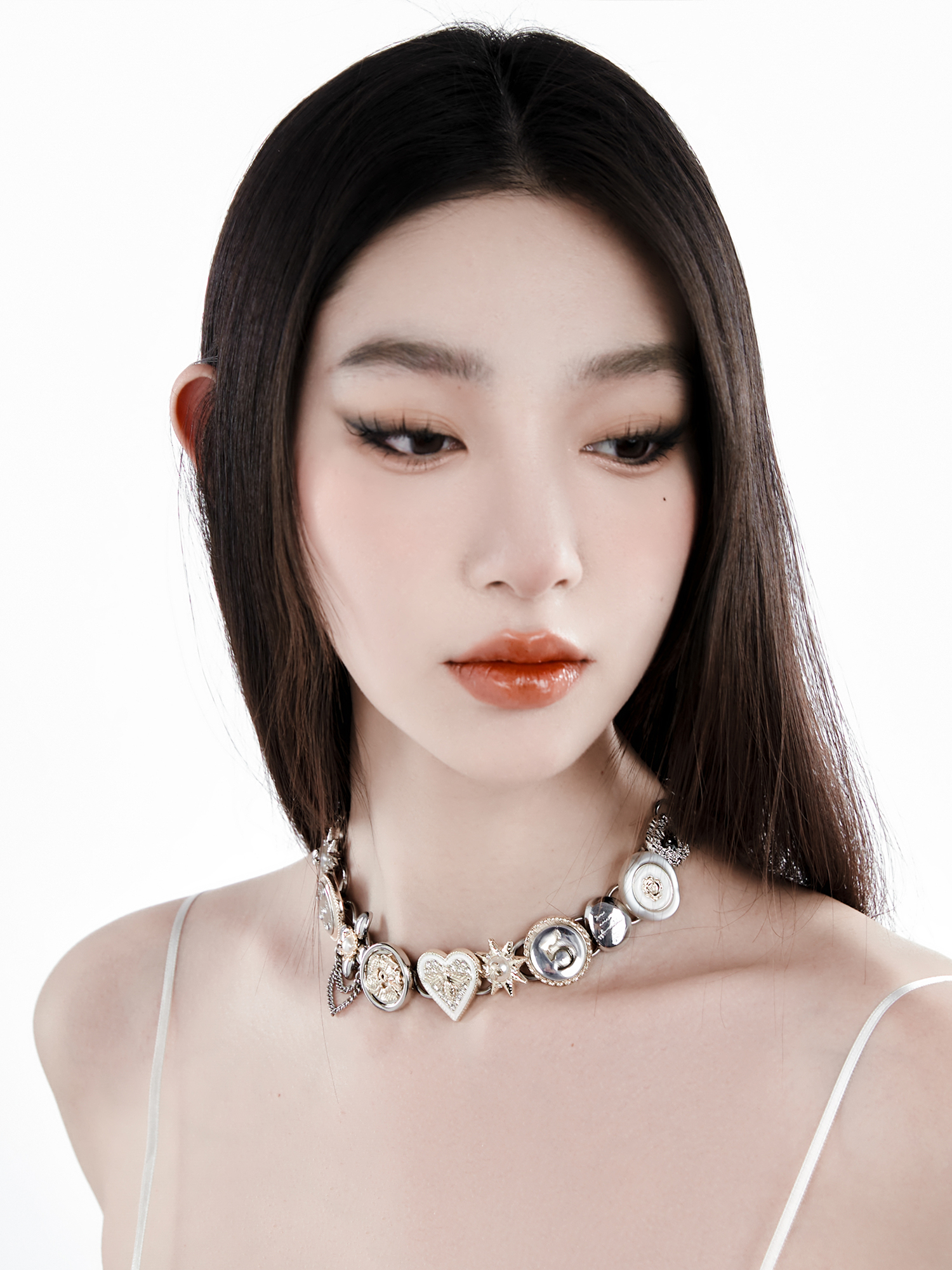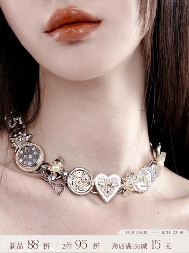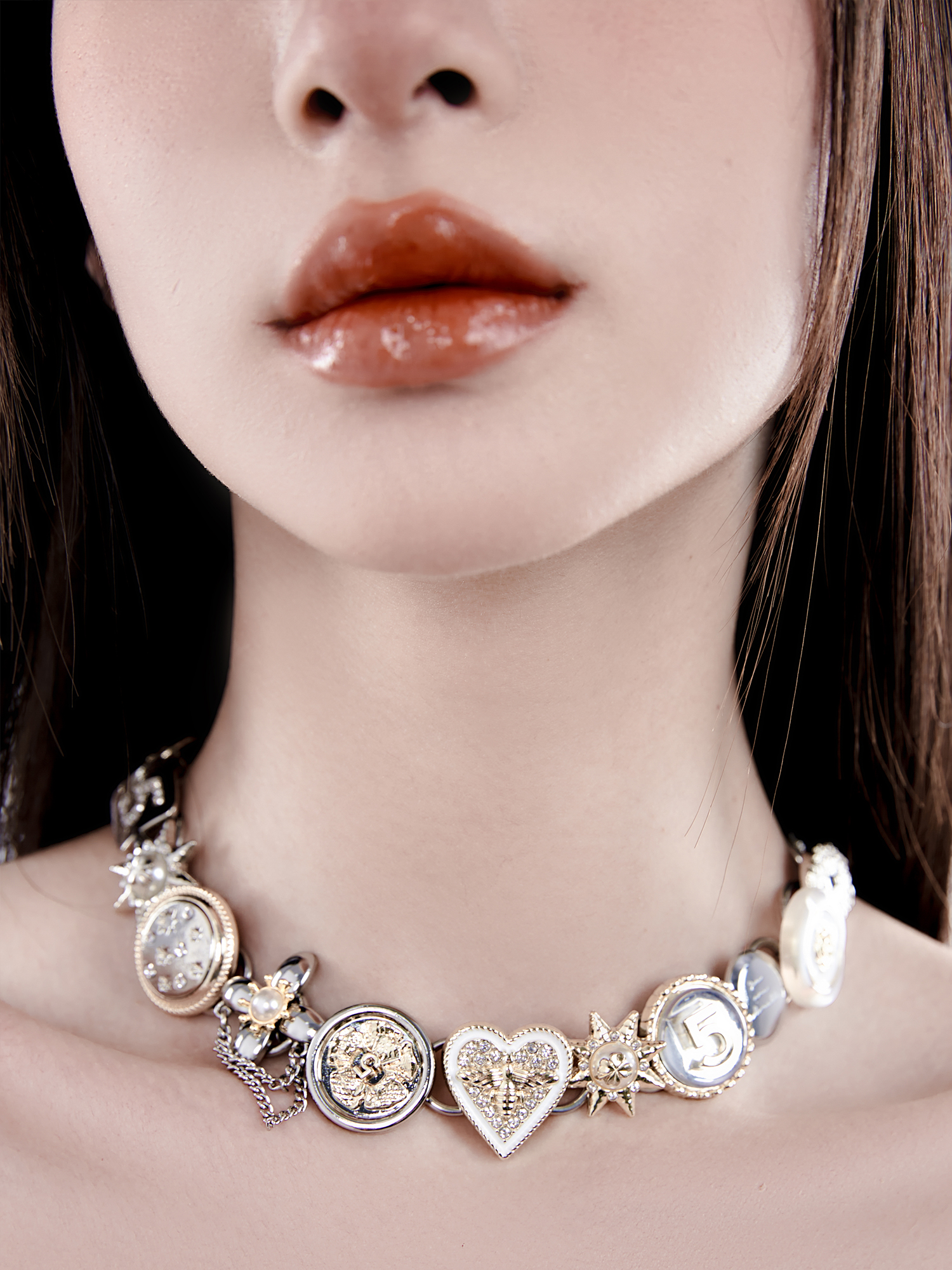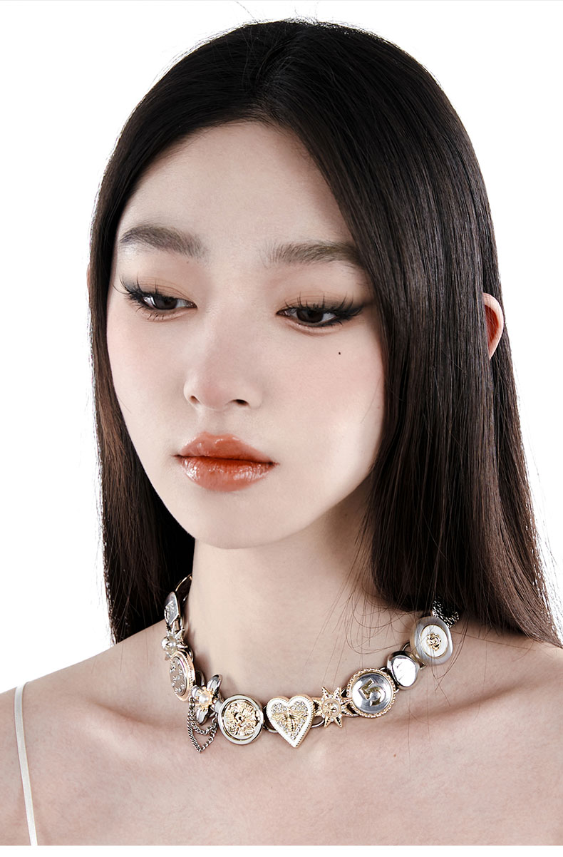 原創金銀紐扣項鍊朋克甜美復古鑲鉆鈦鋼鎖骨鍊