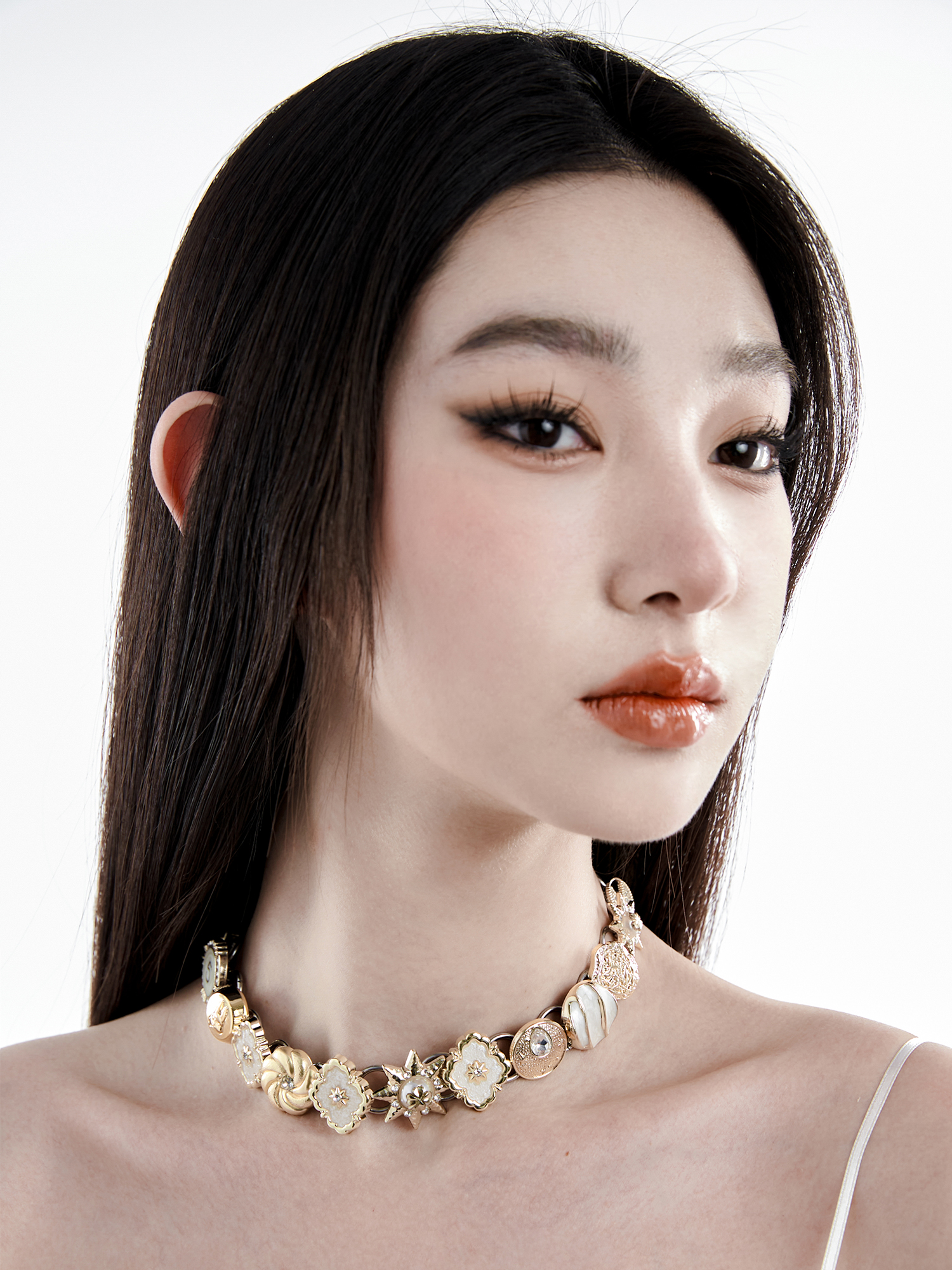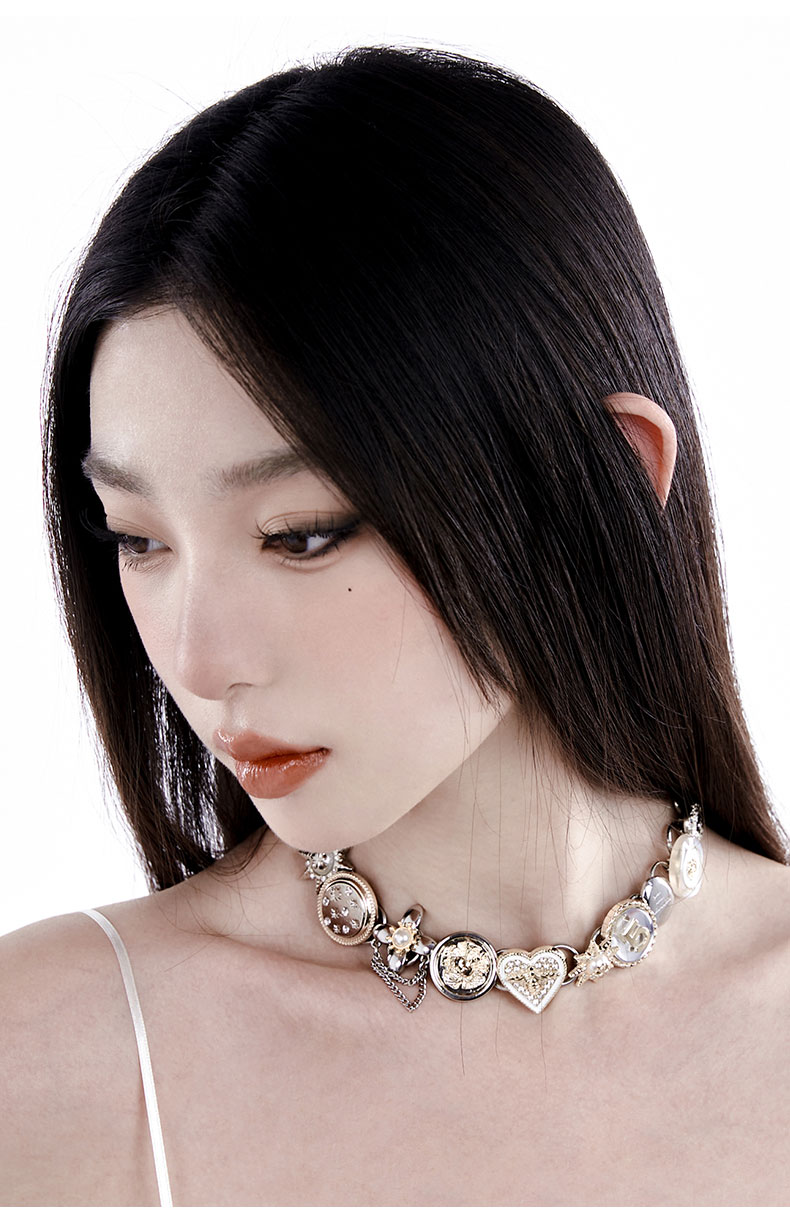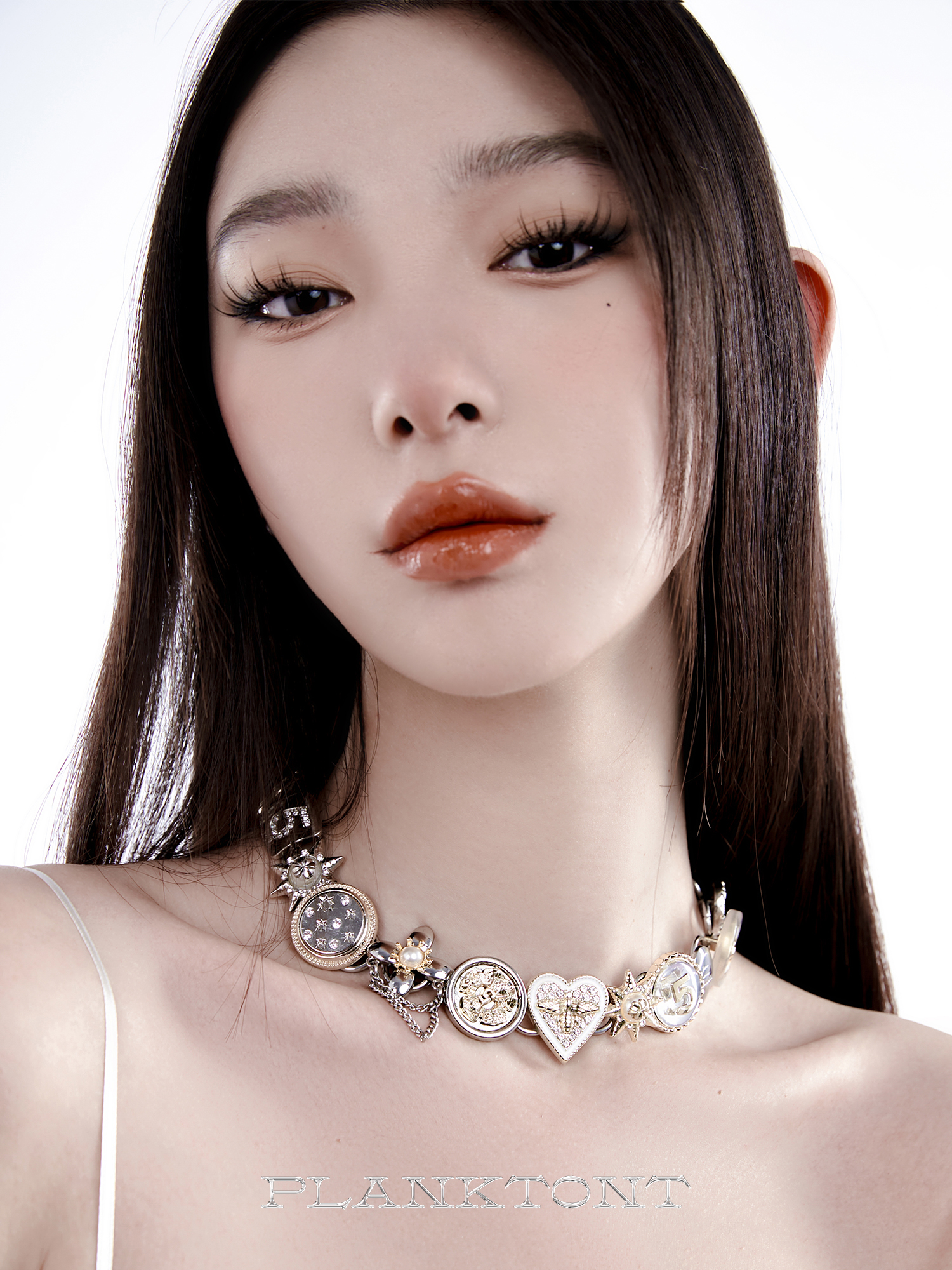 原創金銀紐扣項鍊朋克甜美復古鑲鉆鈦鋼鎖骨鍊