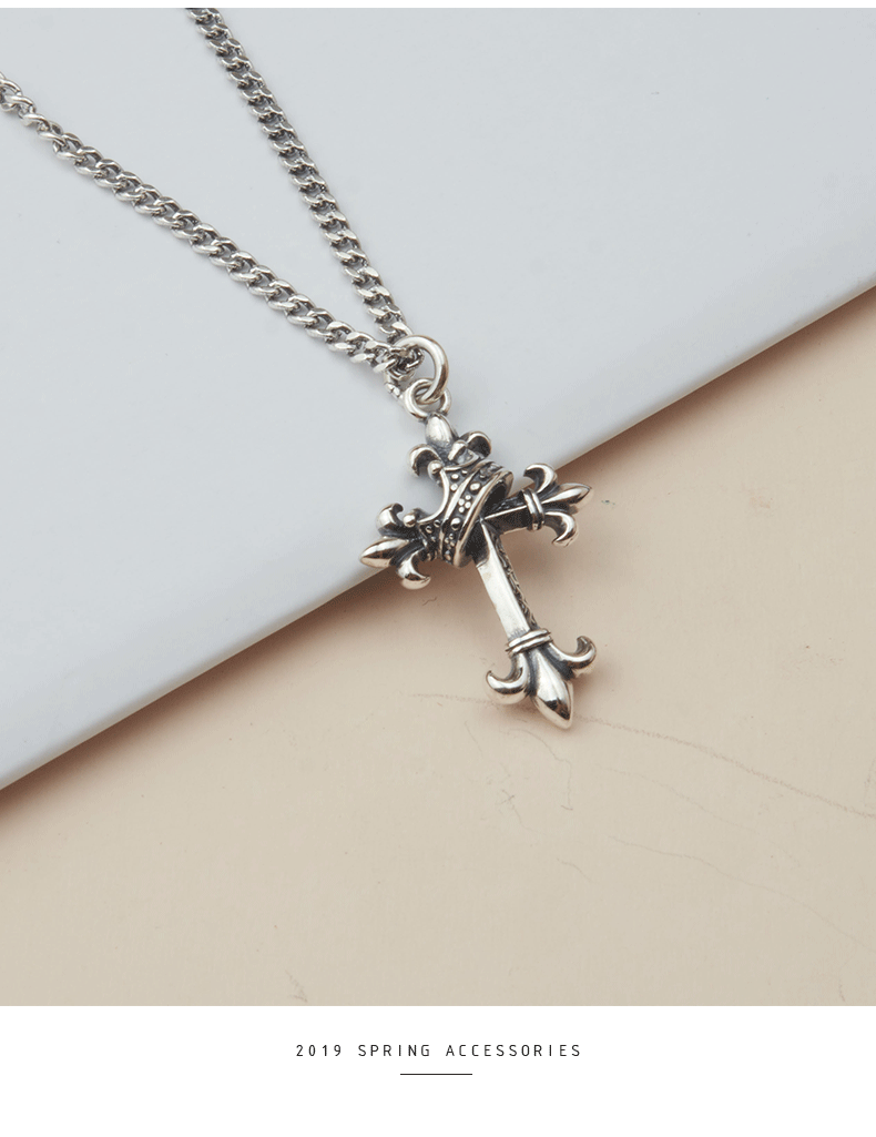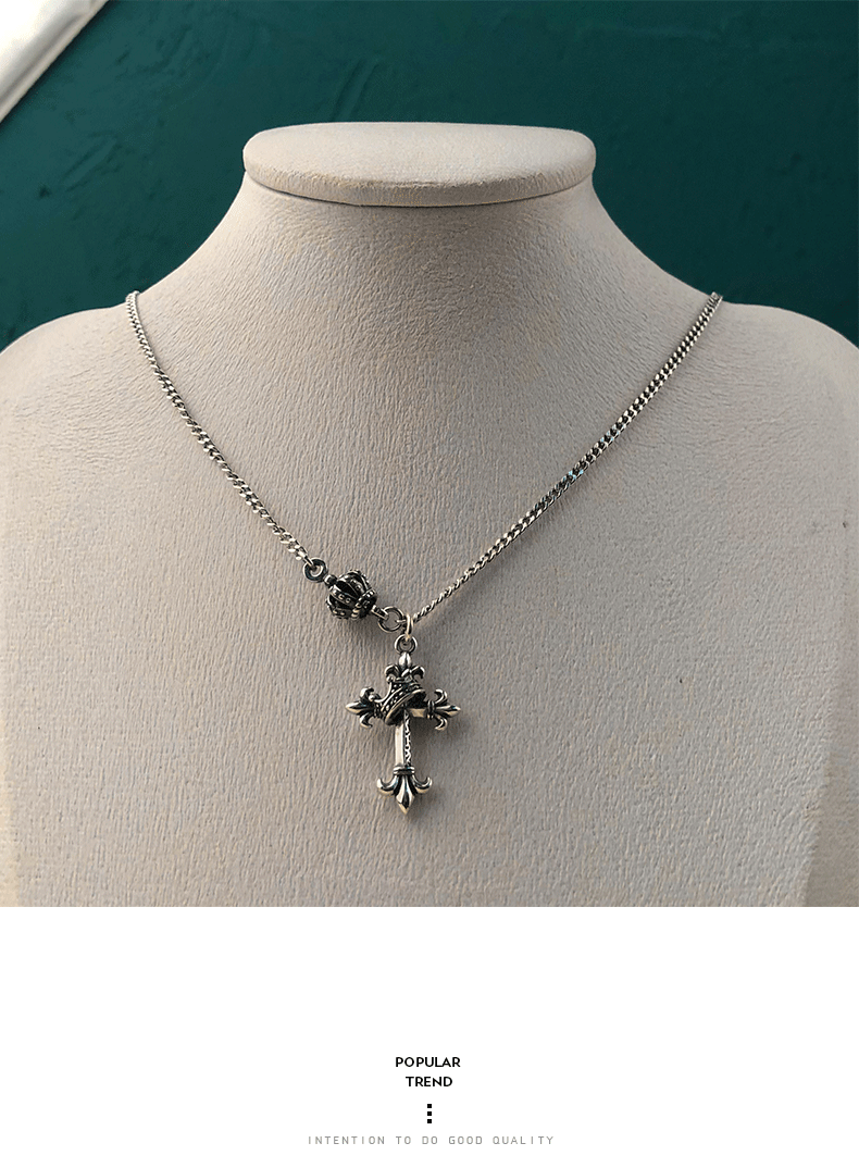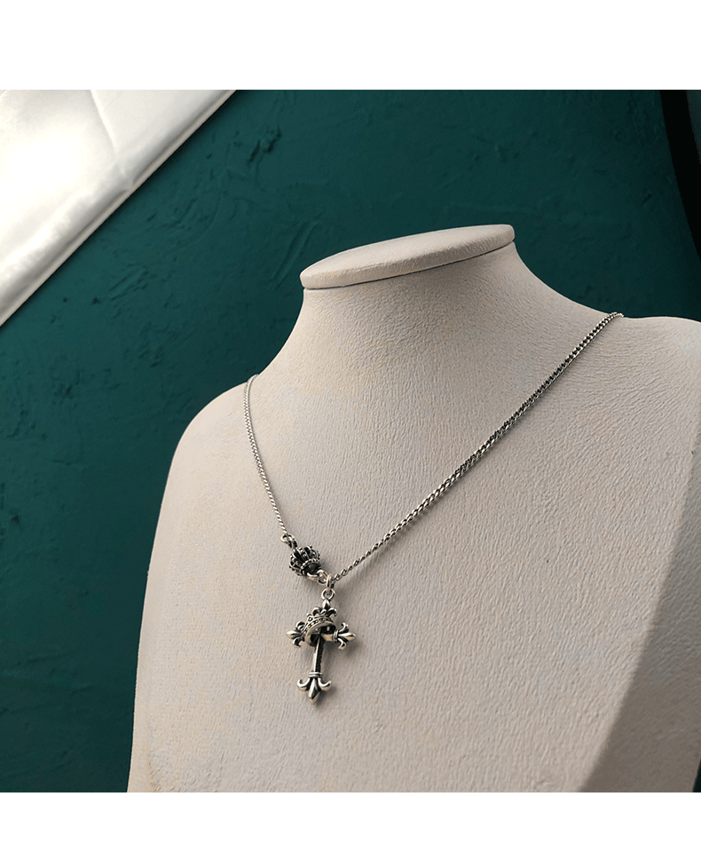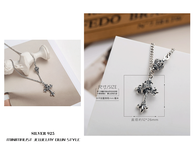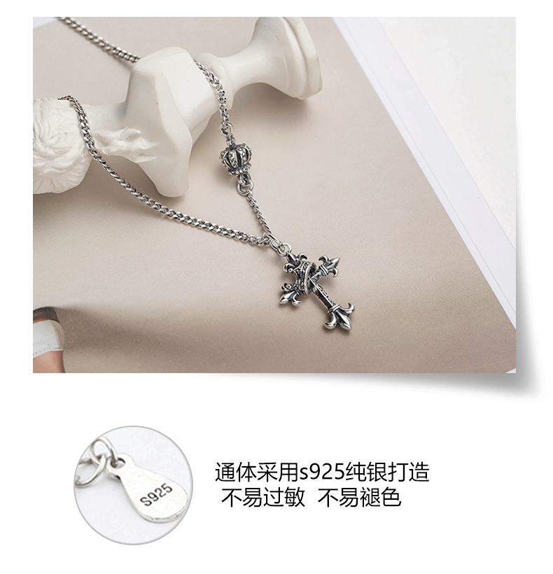 韓國飾品925純銀皇冠項鍊復古十字架毛衣鍊歐美ins嘻哈朋克
