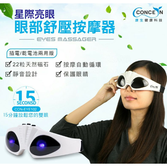 ▶ 精選22顆磁石,有效放鬆眼部神經 ▶ 符合人體工學,配戴舒適 ▶ 智慧型震動循環按摩 ▶ 鬆緊帶可以隨身調整 ▶ 電池+USB插電式兩用 ▶ 產品型號:CON-EYE102 ▶ 額定電壓:5V - USB ▶ 消耗功率:4.5W ▶ 產品尺寸:17.5x7.5x6.6 cm ▶ 產品淨重:281 g ▶ 產品配件:眼部按摩器、電源線X1、說明書X1( 高標準者請勿下標購買