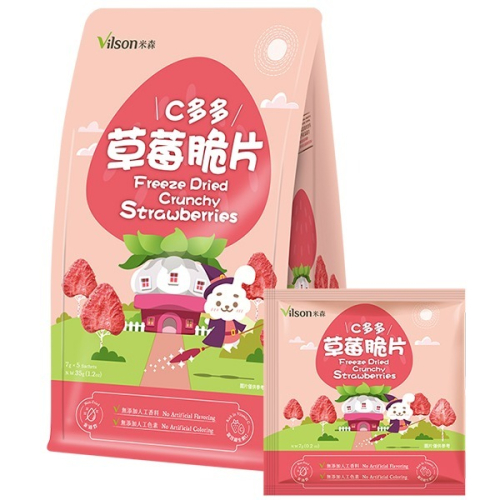 - 米森與泰國大廠合作,嚴選新鮮草莓並採用零下35℃超低溫冷凍乾燥技術,使得每1公斤新鮮草莓僅能製作出100公克的草莓脆果,不僅完全鎖住草莓的香甜,呈現酥脆口感,並保留豐富維生素C,享受單純無添加配方,成為全家人最適合的好點心!