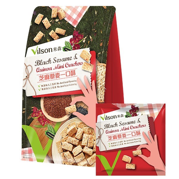 - 『米森』與台灣本土餅乾大廠合作,以香濃芝麻與台灣紅藜為基底,經過多次配方調整,並以專業烘焙技術完美結合芝麻、紅藜與燕麥纖維,全程無添加人工香料與色素,打造出口感與營養兼具的芝麻藜麥一口酥,搭配便利隨手包,每一口都是停不下來的雙重享受!