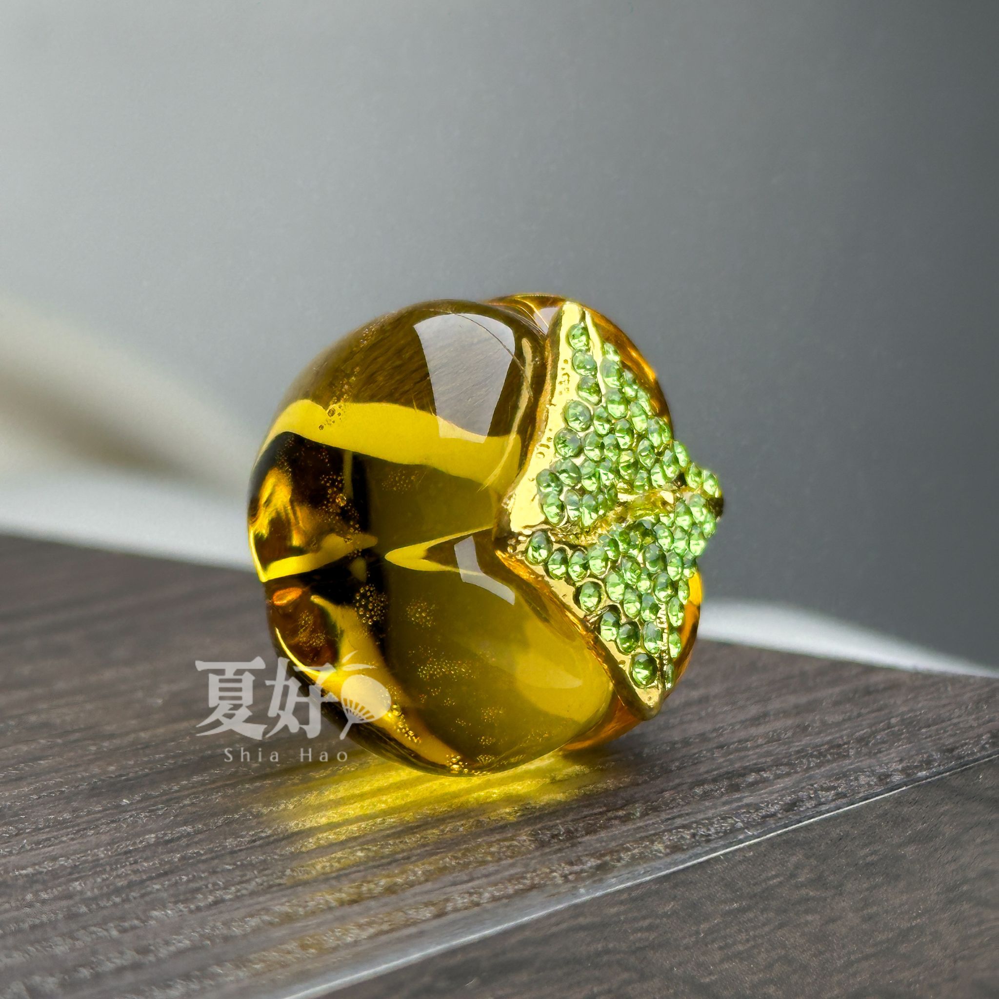 ⚘ 柿子上葉片以琺瑯漆鍍工合金製成與鑽點綴,閃耀著低調而細緻的光澤,為整體增添一抹亮眼光彩。