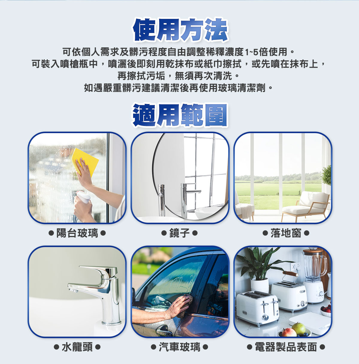 1.使用於玻璃、傢俱時,請距離清潔物約20公分處噴灑,再用乾布或紙巾擦拭即可。