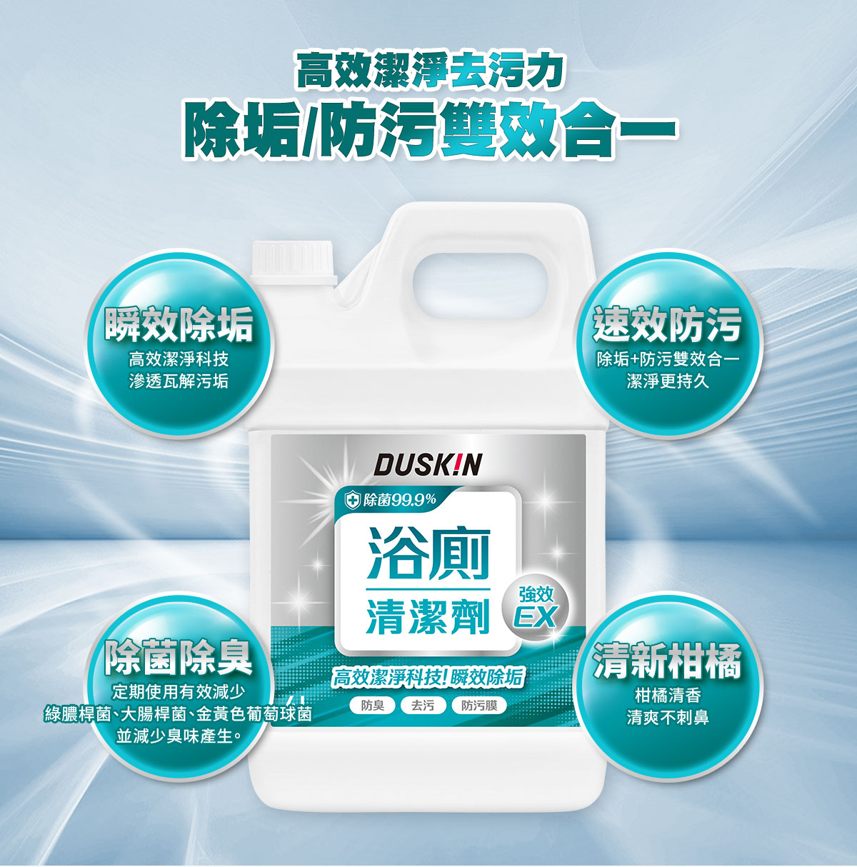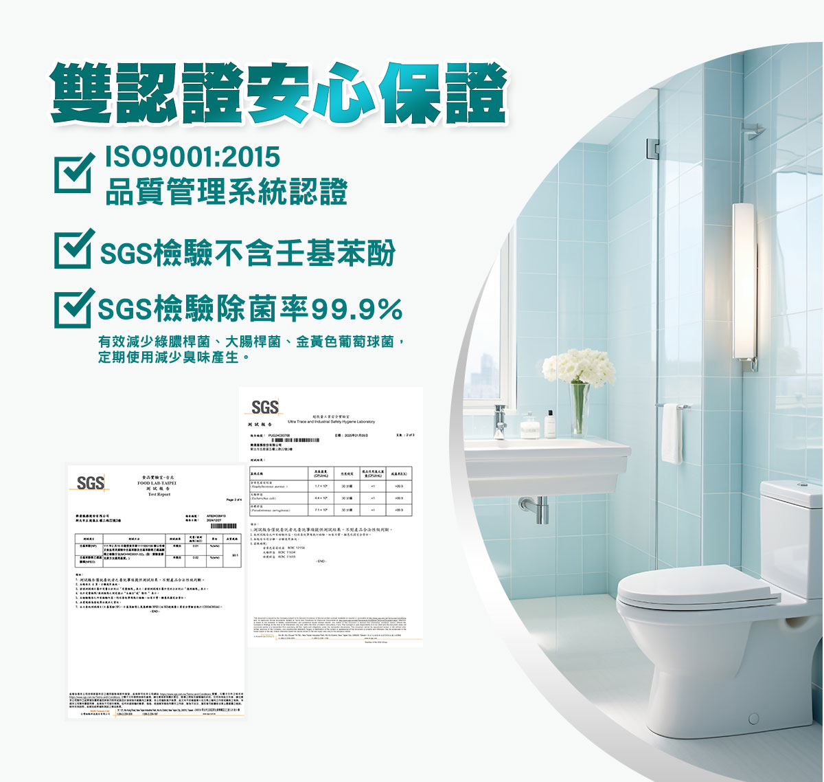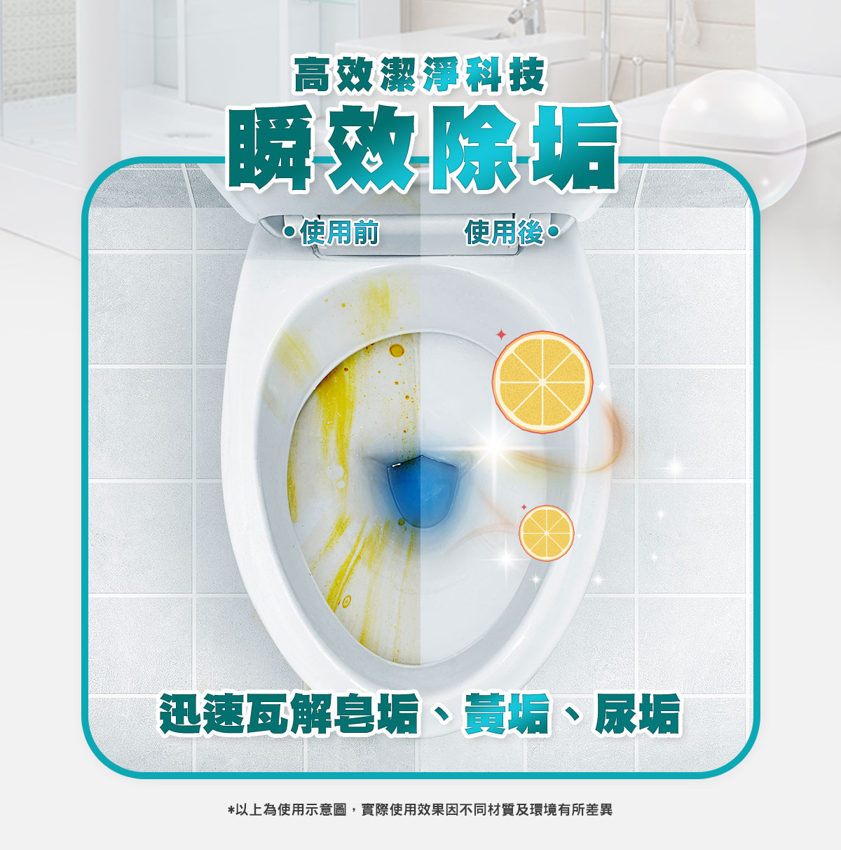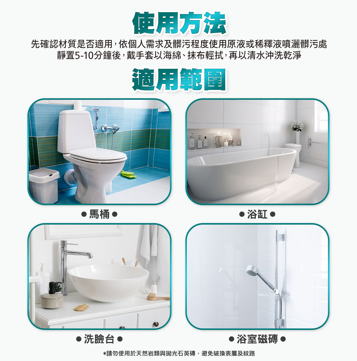 【注意事項】 欲使用於深色衛浴設備或大理石,請先試噴於不明顯處,5分鐘後若無變色情形再行使用。