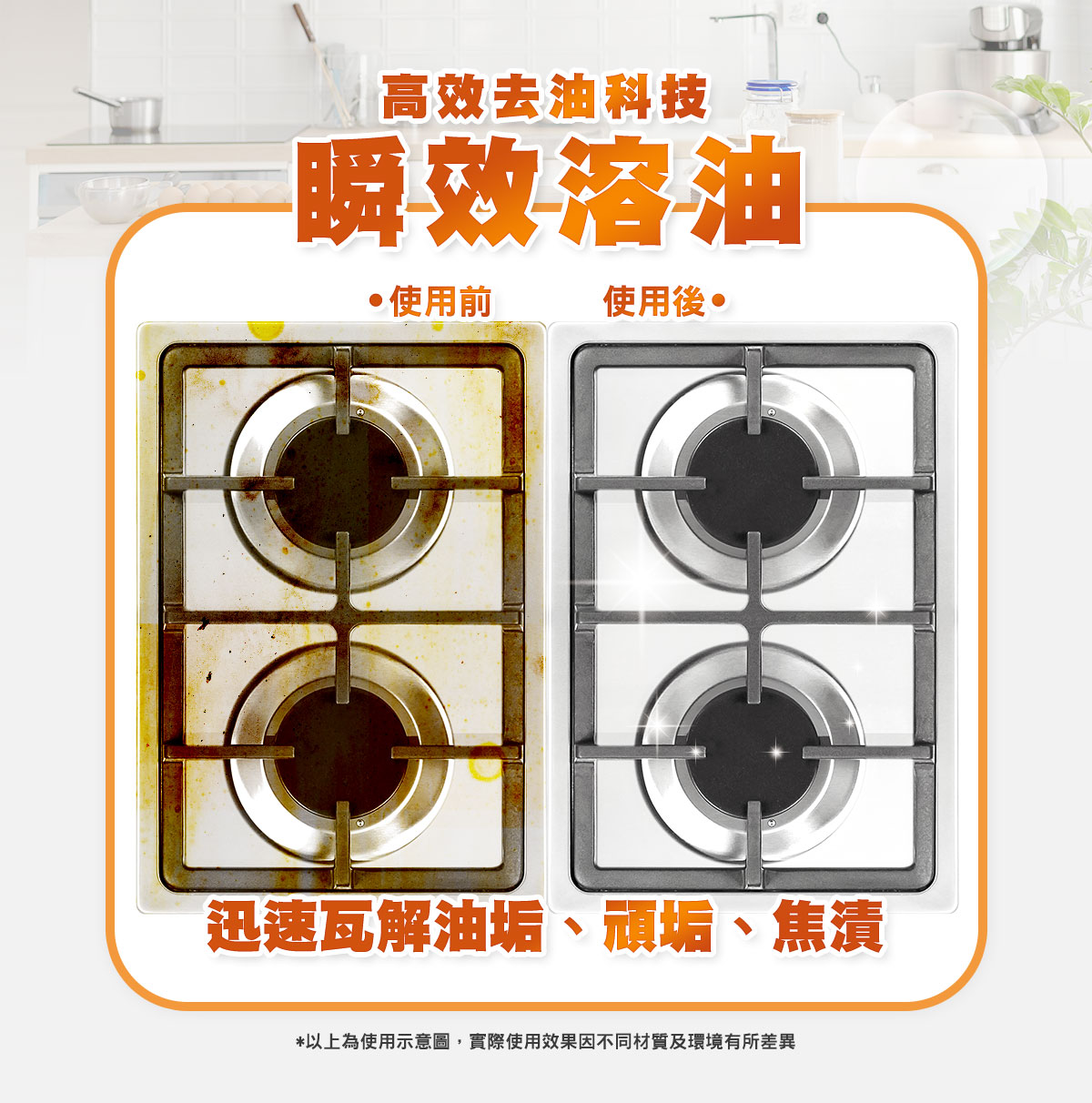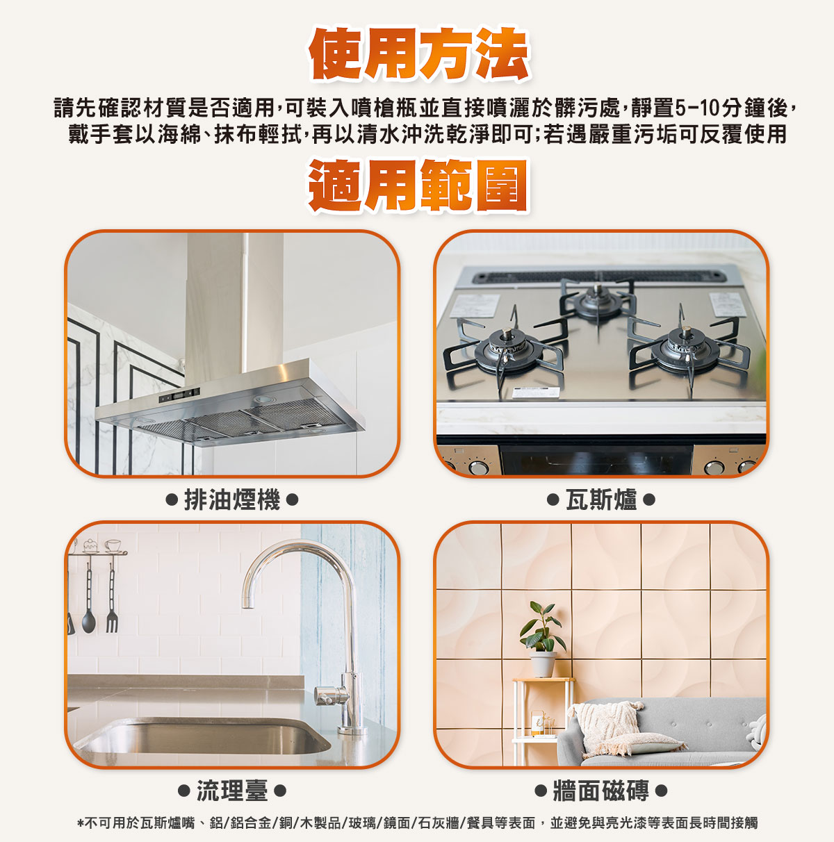 【用途】 排油煙機、瓦斯爐、抽風機、流理台、廚房櫥櫃、壁磚等廚房器具清潔使用。