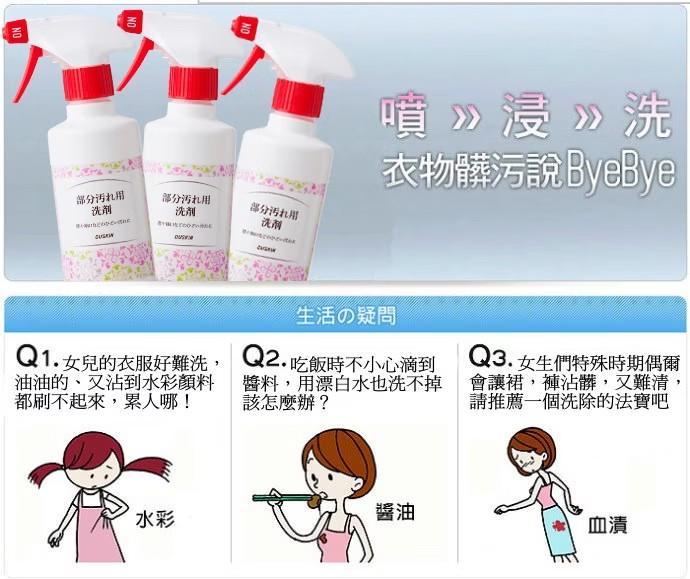 使用方法 直接噴灑於衣物污垢、發黃、汗垢等處,靜置3~5分鐘,再以一般洗滌分式清洗。