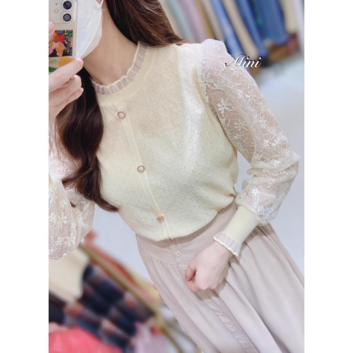 珍珠釦袖拼蕾絲木耳領透膚針織上衣