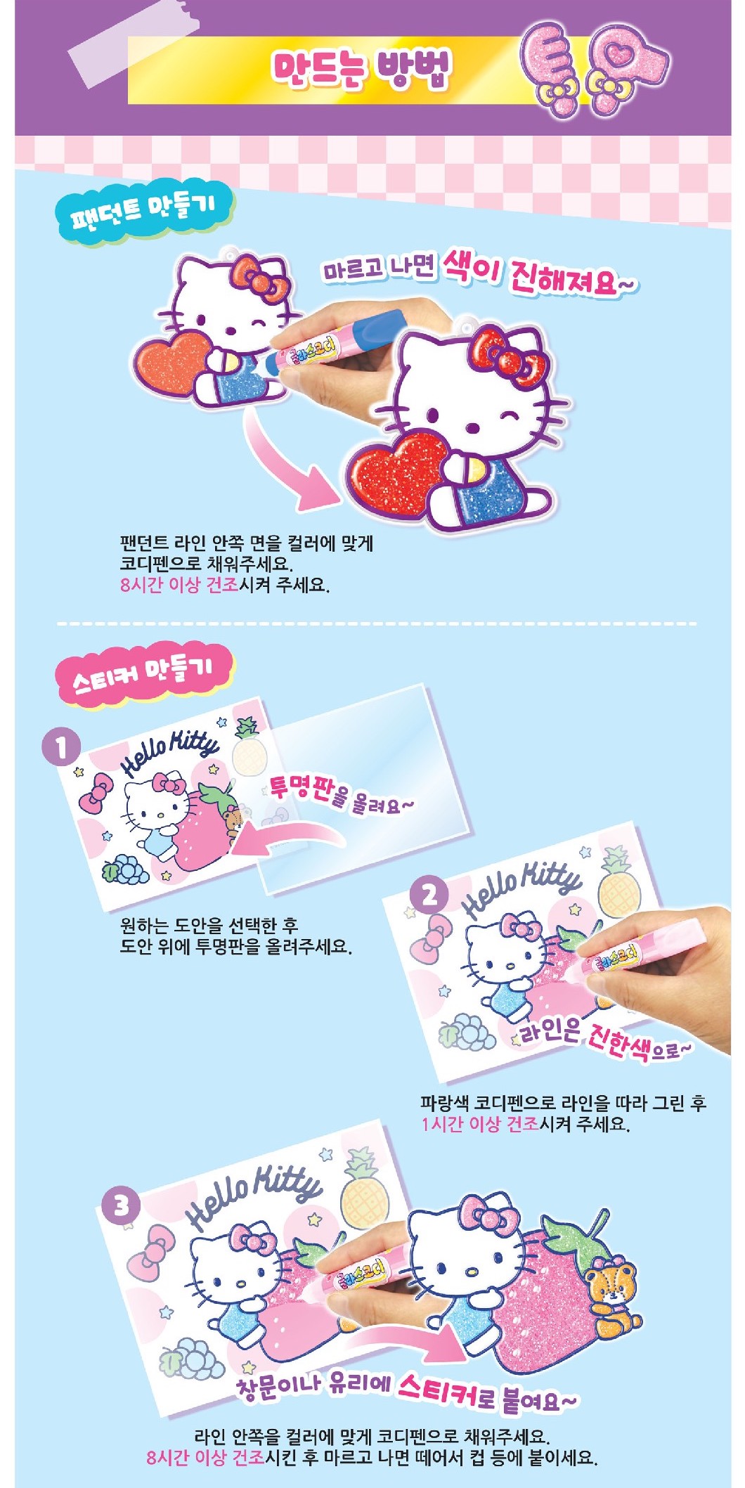 使用方式:將透明卡放在圖卡上,依圖卡先畫出黑色的輪廓並靜置一小時,再將其它顏色依序填滿,成品靜置八小時完全乾燥後即可從透明卡上取下,可以貼在窗戶、玻璃、或是其它光滑的平面上喔!