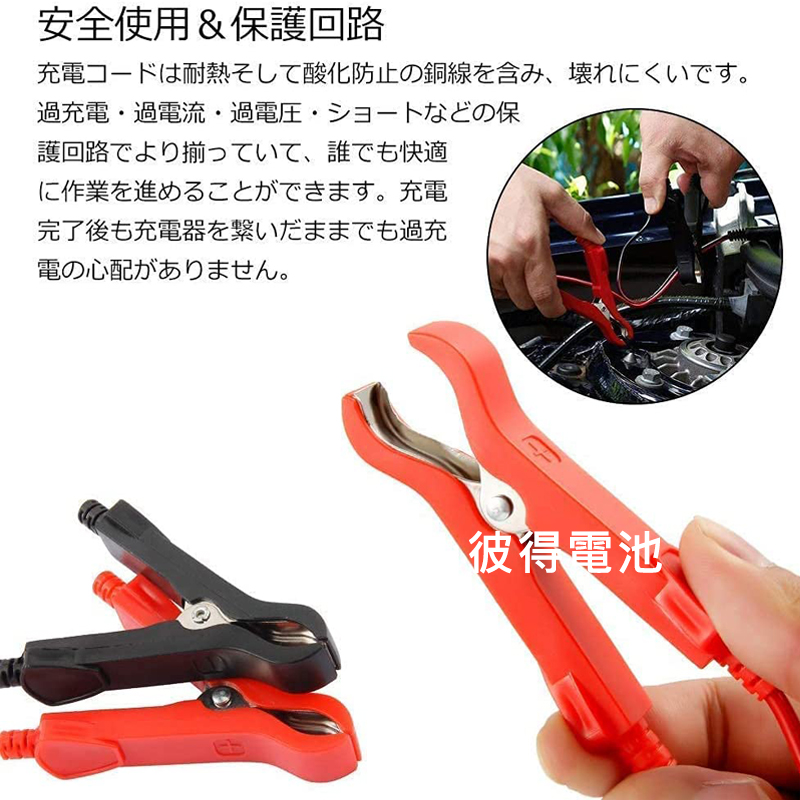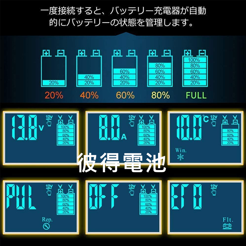 • 電池の種類: カルシウム、ゲル、agm、ウェット、鉛酸などを含むほとんどの種類の鉛蓄電池。