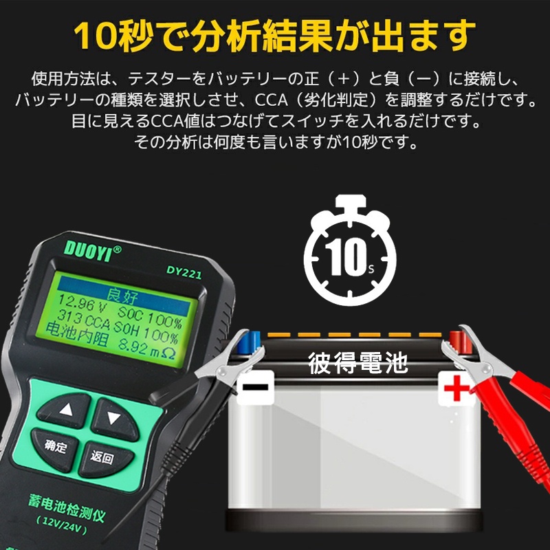 電池測試儀採用專利技術SLDR對電池進行診斷。 SLDR(Single Load Dynamic Resistance)是一種通過瞬時流過假定汽車發動機啟動電壓的高壓電流來測量電池內部狀態的技術。 SLDR測量可以純粹測量電池內部狀態,而不會被電池內部的表面電荷、殘餘電荷、接觸阻抗所混淆,因此可以推導出更準確的電池容量測量和診斷結果。 它不受熱的影響,因此可以快速、準確和重複地進行測試,而不會拉傷電池。