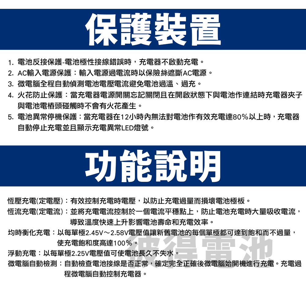 ◎ 電池反接保護:電池極性接線錯誤時,充電器不啟動充電。微電腦全程自動偵測電池充電電壓及充電電流避免電池過溫過充。