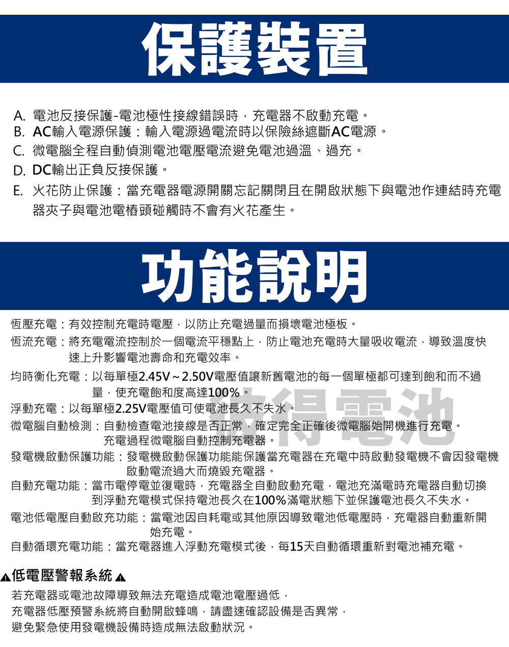 ◎ 微電腦恆壓充電控制(定電壓充電模式):有效控制充電時電壓,以防止充電過量而損壞電池極板。