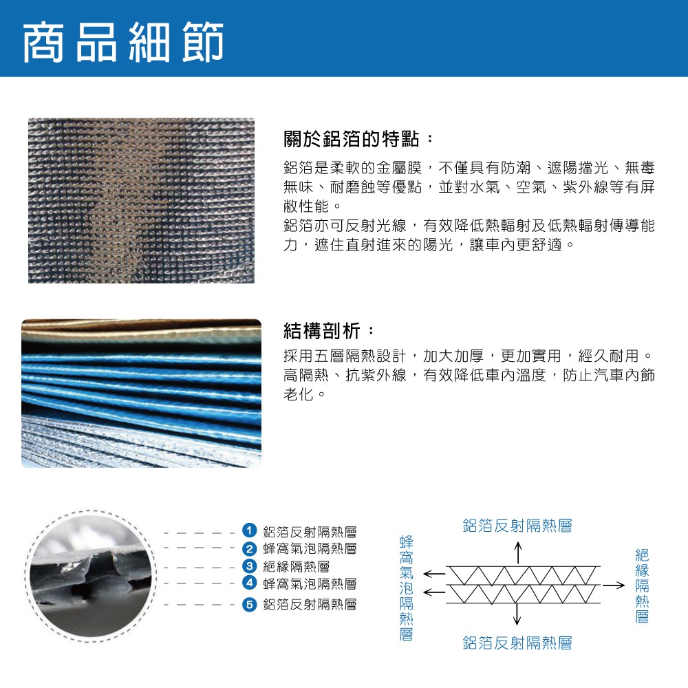 ◆採用雙面鋁膜材質,中間層採用隔熱氣泡,有效阻隔太陽光與紫外線