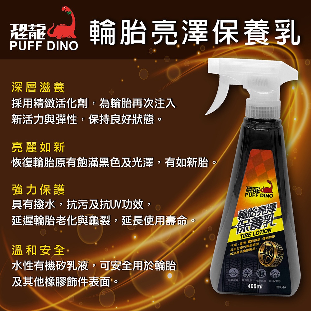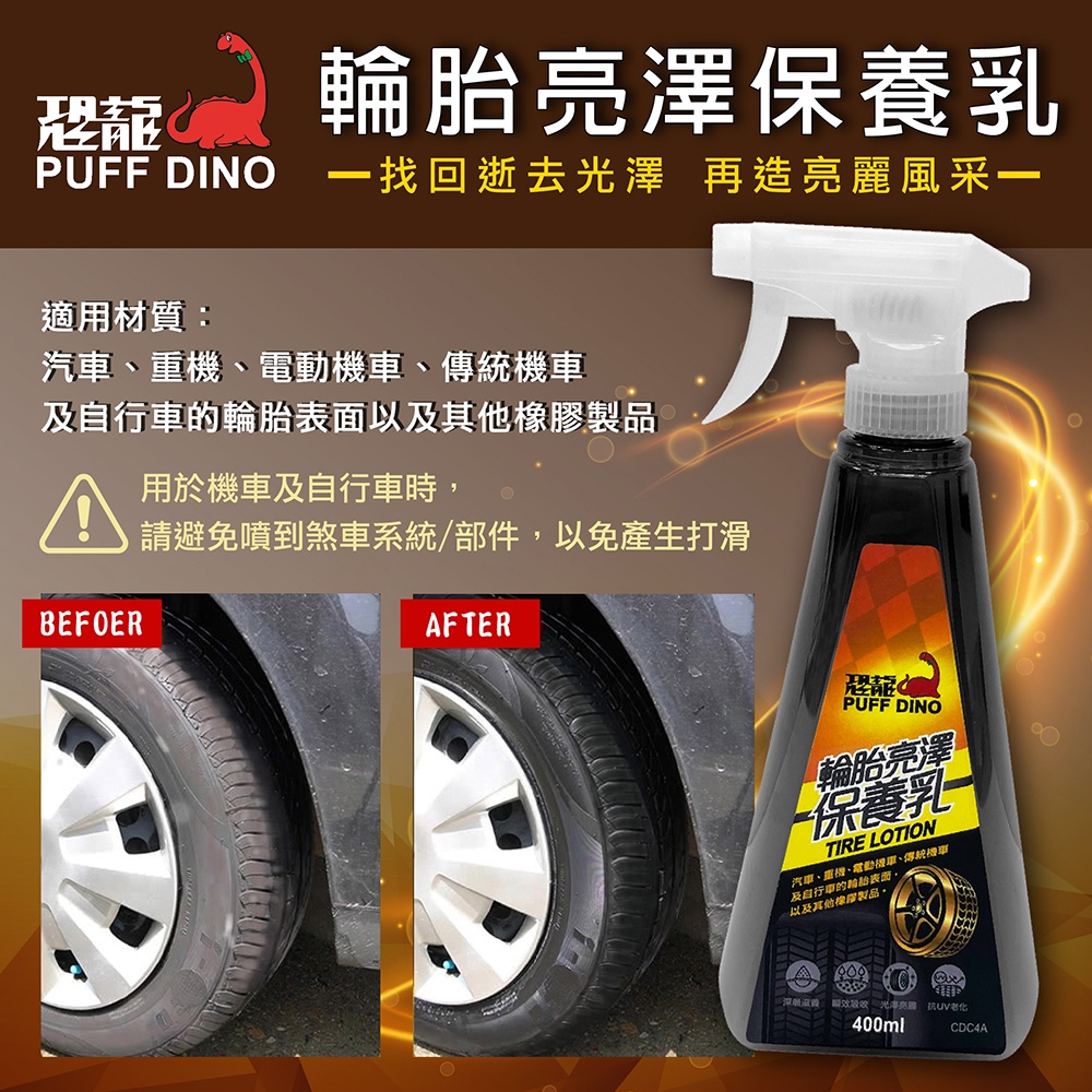 採用水乳性配方,專用於養護輪胎,深層滋養恢復光澤,使用後不會造成車輛打滑。在表面形成保護膜,具有撥水抗污及抗UV的功效,延緩輪胎老化與龜裂,增加輪胎使用壽命。其他橡膠材質產品也適用。