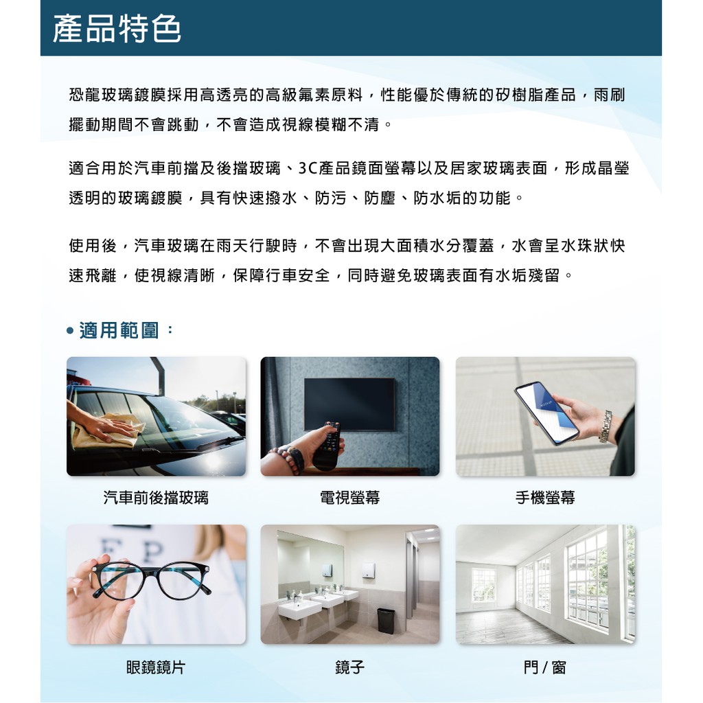適合用於汽車前擋及後擋玻璃、3C產品鏡面螢幕以及居家玻璃表面,形成晶瑩透明的玻璃鍍膜,具有快速撥水、防污、防塵、防水垢的功能。