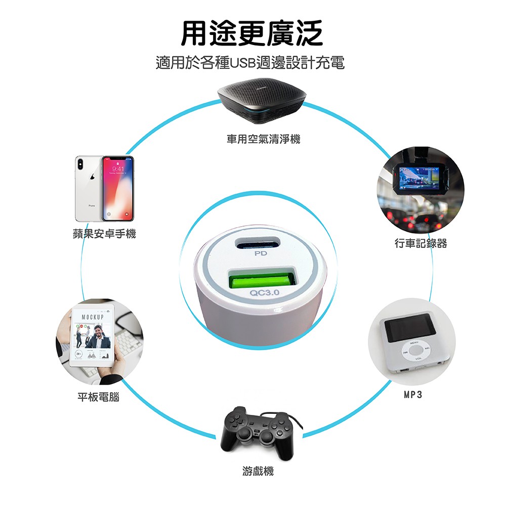 ◆ QC3.0+Type-C PD 適用各類3 C產品USB充電