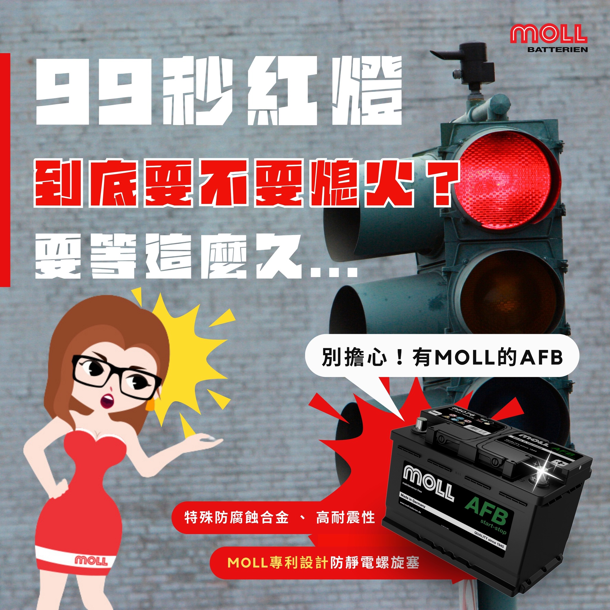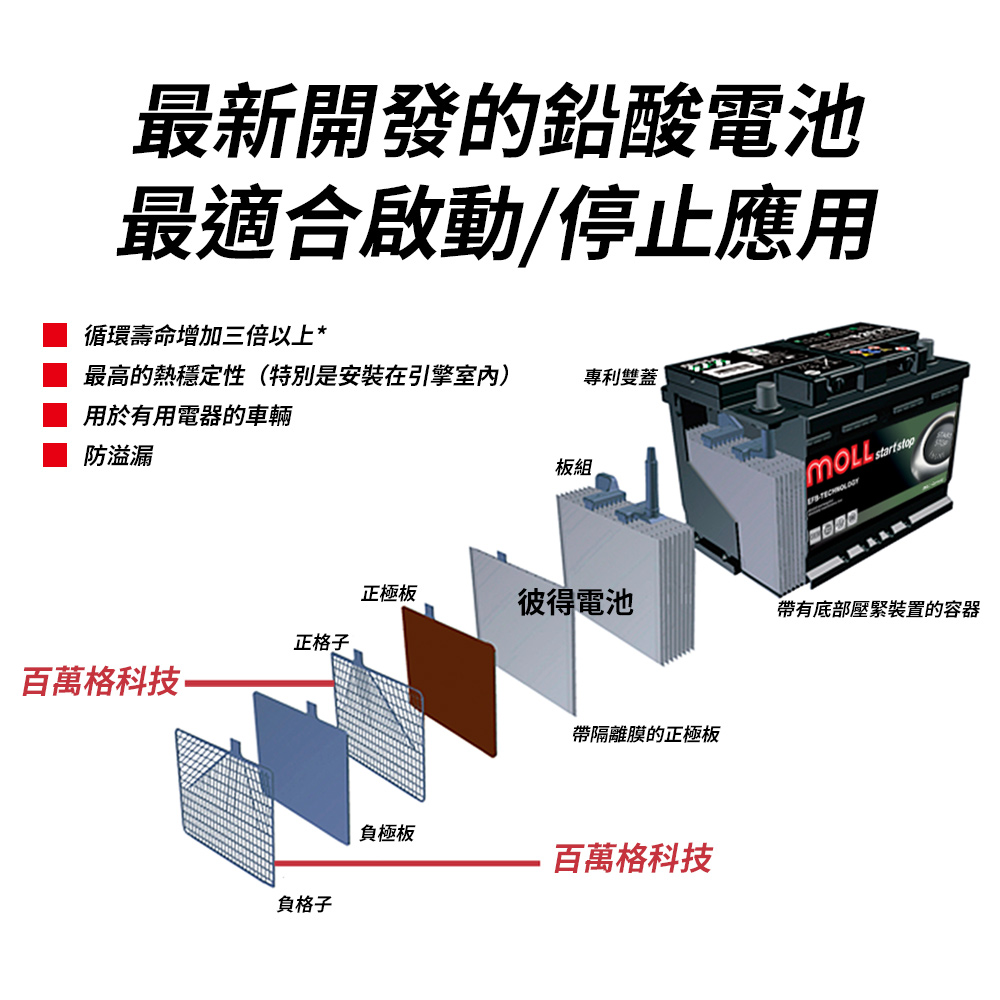 隨著為微-混應用(啟|停與再生)車款的問世,為了增加電池使用壽命,MOLL 特別針對電極的活性物質所研發的特殊配方。