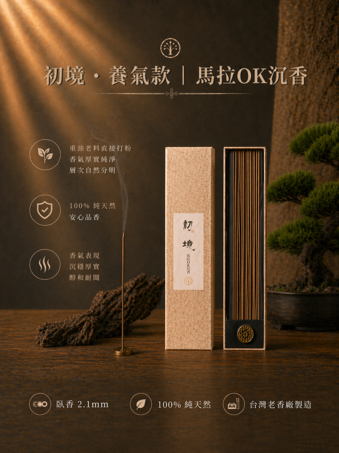 初境・養氣款,選用馬拉OK系沉香原材,並於台灣在地生產製作。