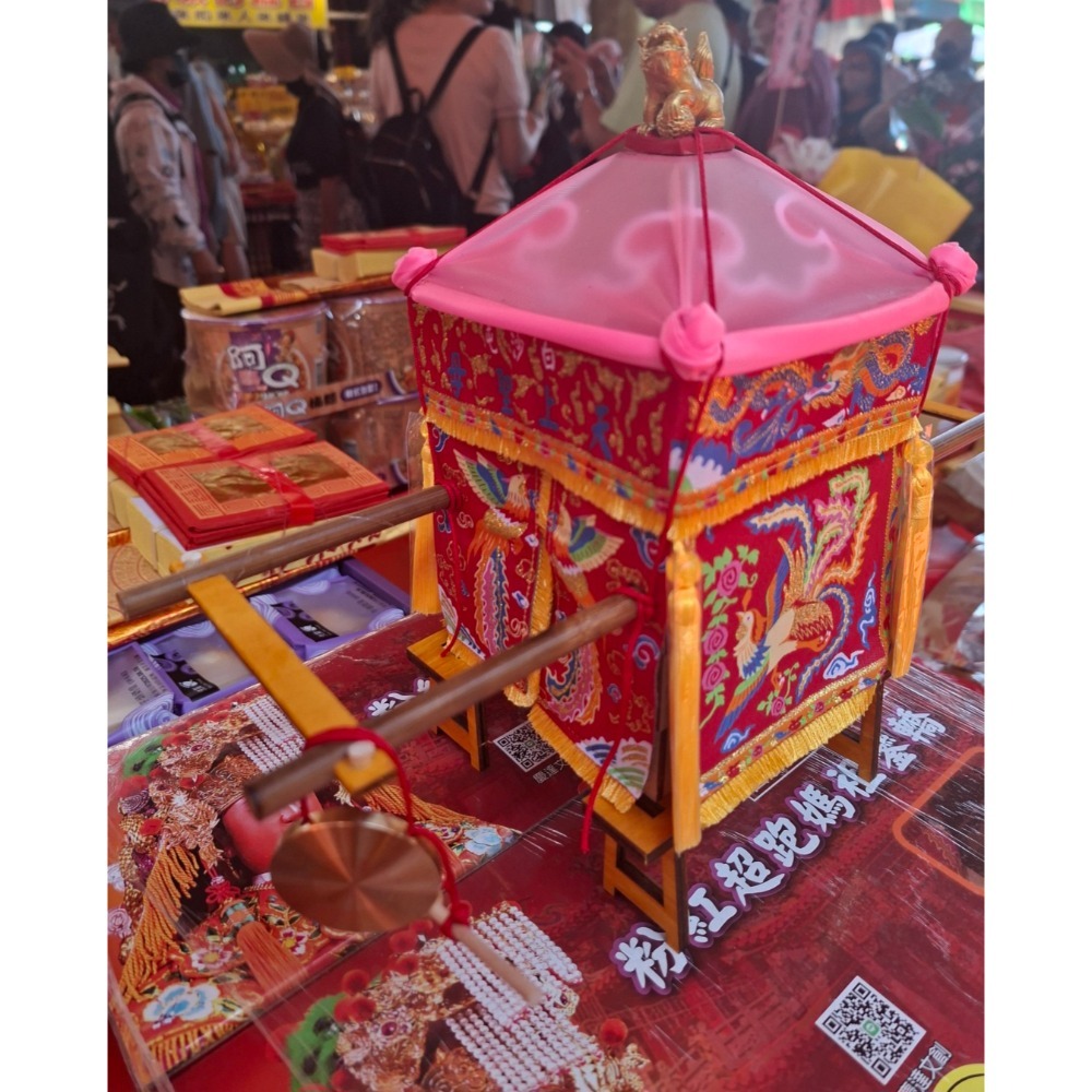 每組內都有限量編號,獨家製作真竹子轎棍、横桿可拆卸,內有層板方便放入公仔神像,加厚轎椅擺放更穩固,附贈純銅銅鑼一面、四疊仿真壓轎金,轎内貼有白沙屯聖母神像,整體外觀精美轎布繡品皆擬真粉紅超跑製作。