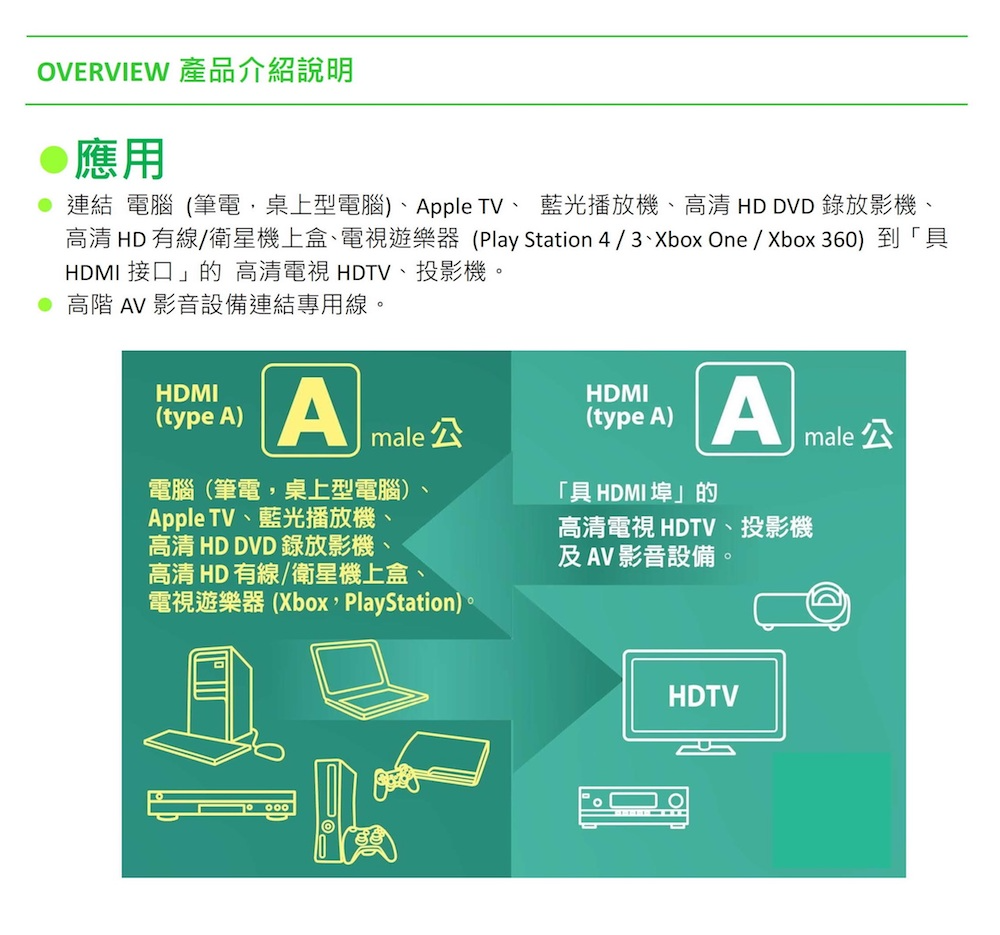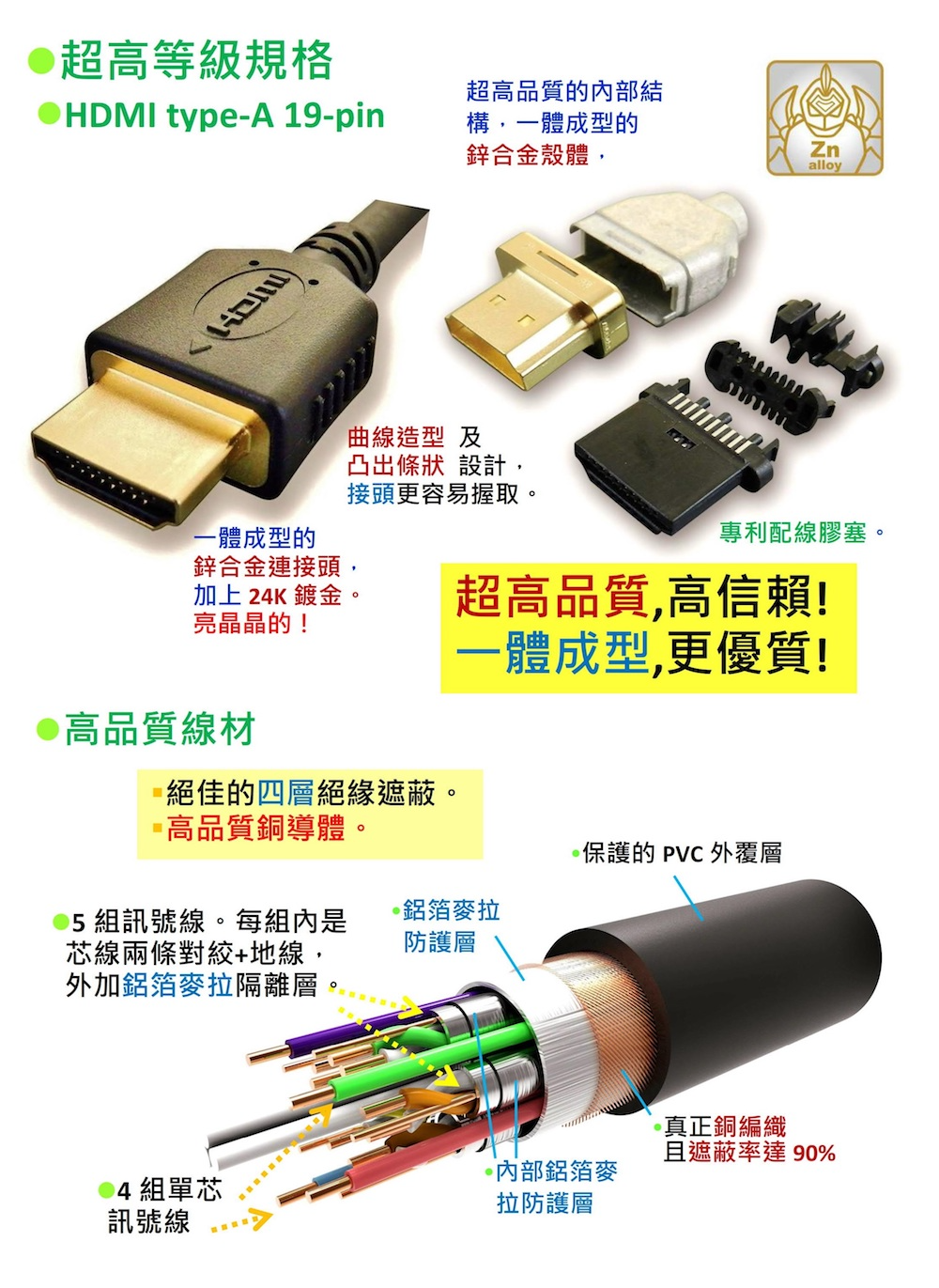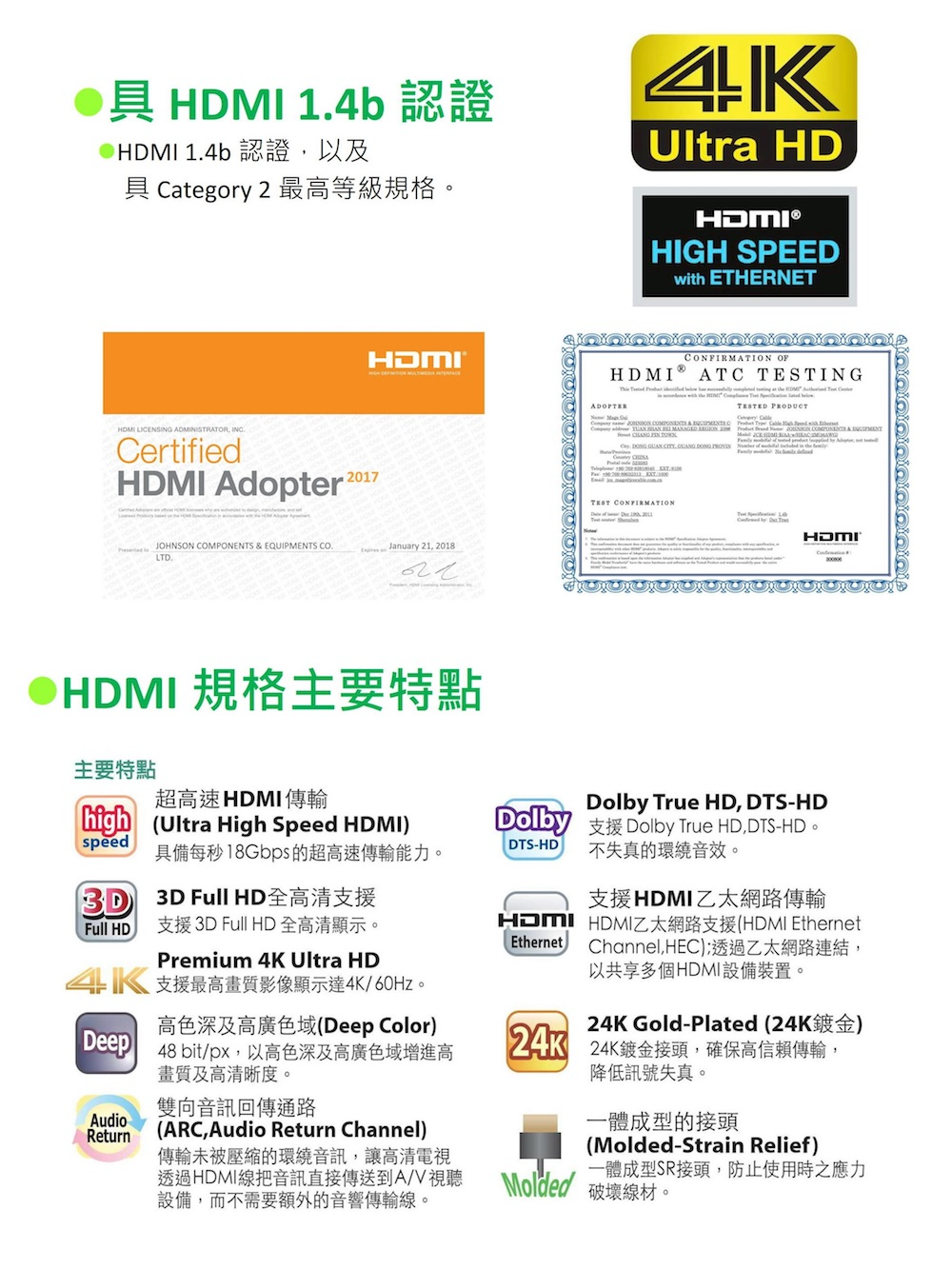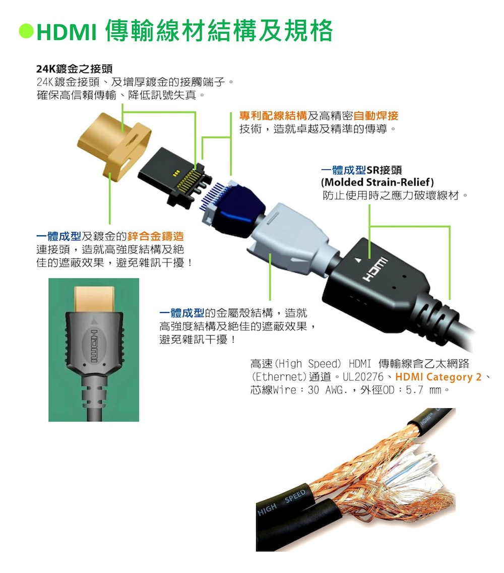 • 一體成型SR接頭 (Molded – Strain Relief),防止使用時之應力破壞線材。 *線材規範UL20276。HDMI Category 2。 *HDMI 1.4,高速(High Speed) HDMI含乙太網路(Ethernet)通道。