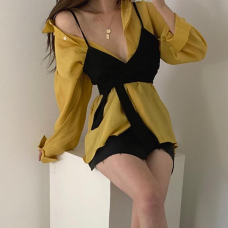 DearGod正韓女裝韓國chic套裝女修身收腰裹胸 洋氣長袖襯衫 卡其高腰顯瘦A字短裙