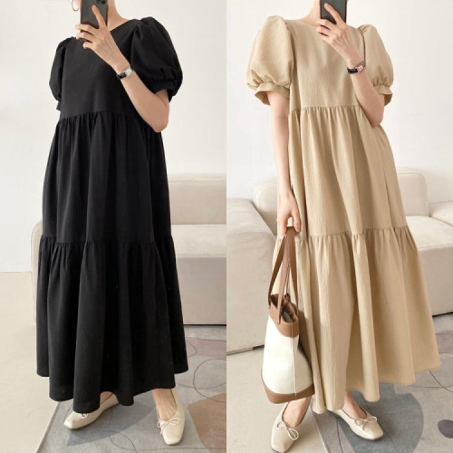DearGod正韓女裝韓國簡約ins夏季法式復古泡泡袖過膝極簡風寬松大擺長款連身裙
