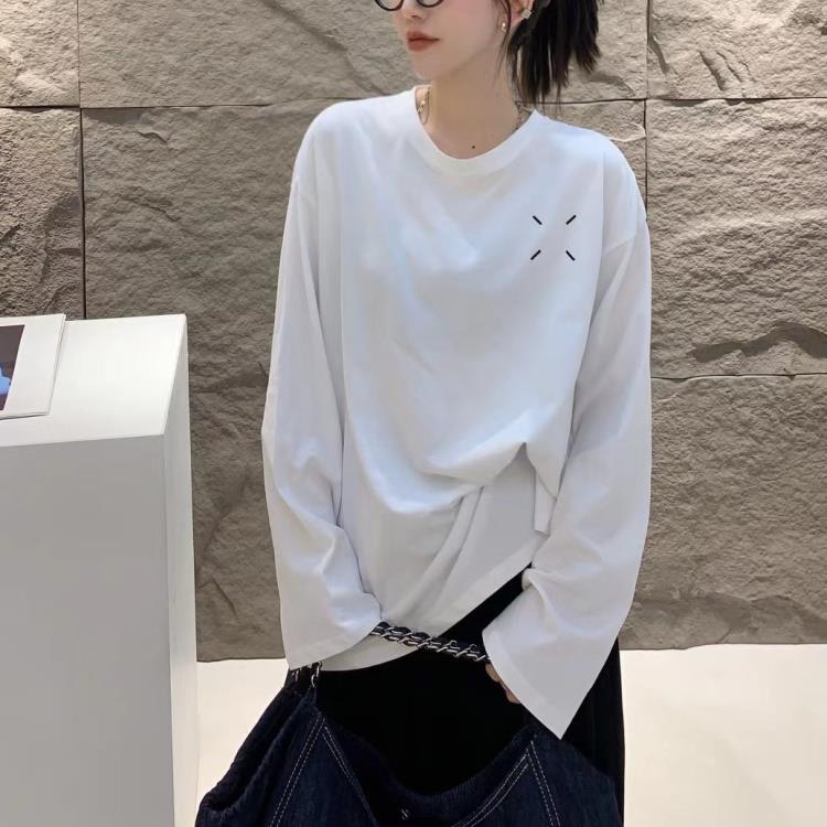 DearGod正韓女裝歐洲站2022秋冬圓領胸口明線設計長袖寬松后背貼標打底白T恤女潮