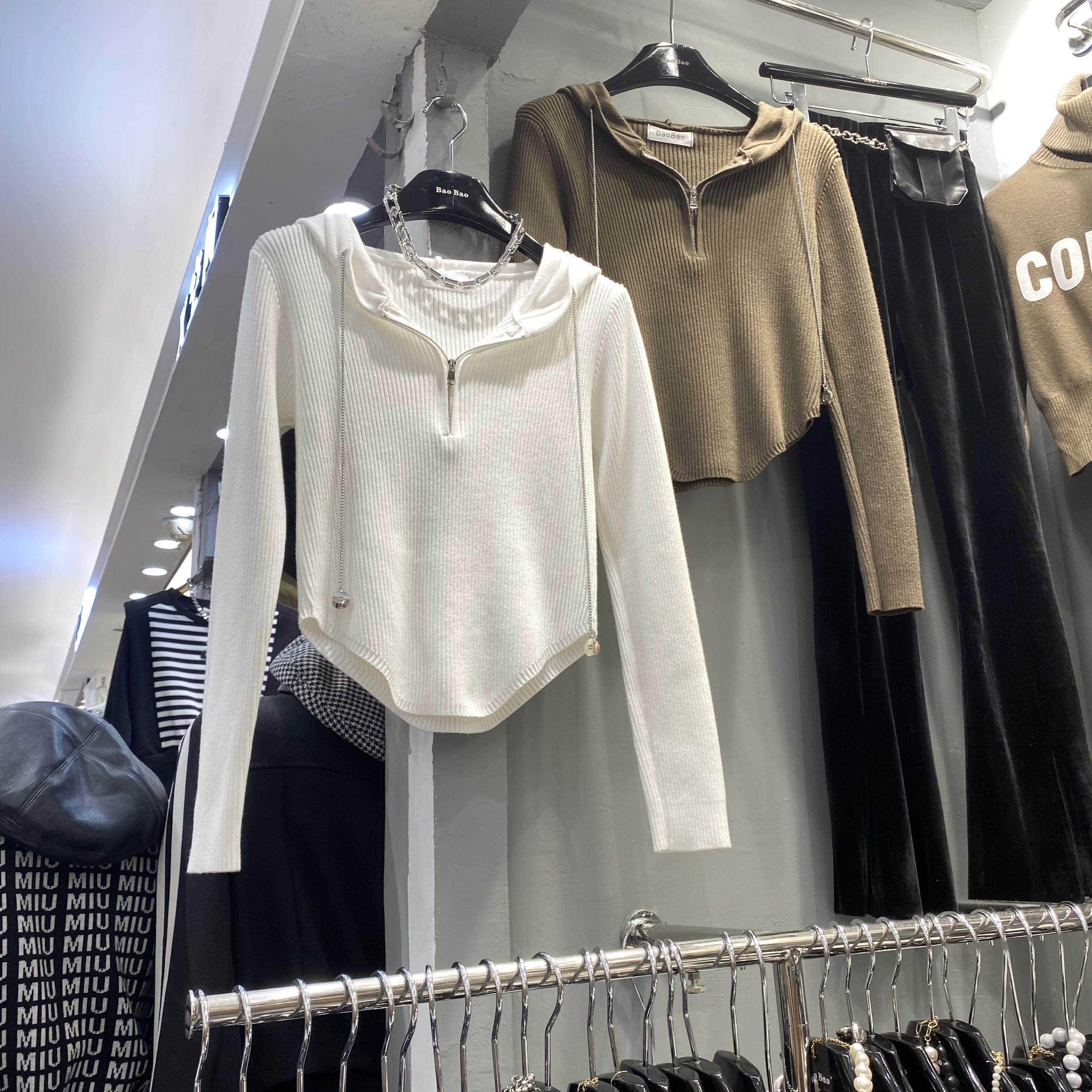 DearGod正韓女裝BaoBao短款連帽半拉鍊針織衫女韓國冬季簡約純色修身顯瘦百搭上衣