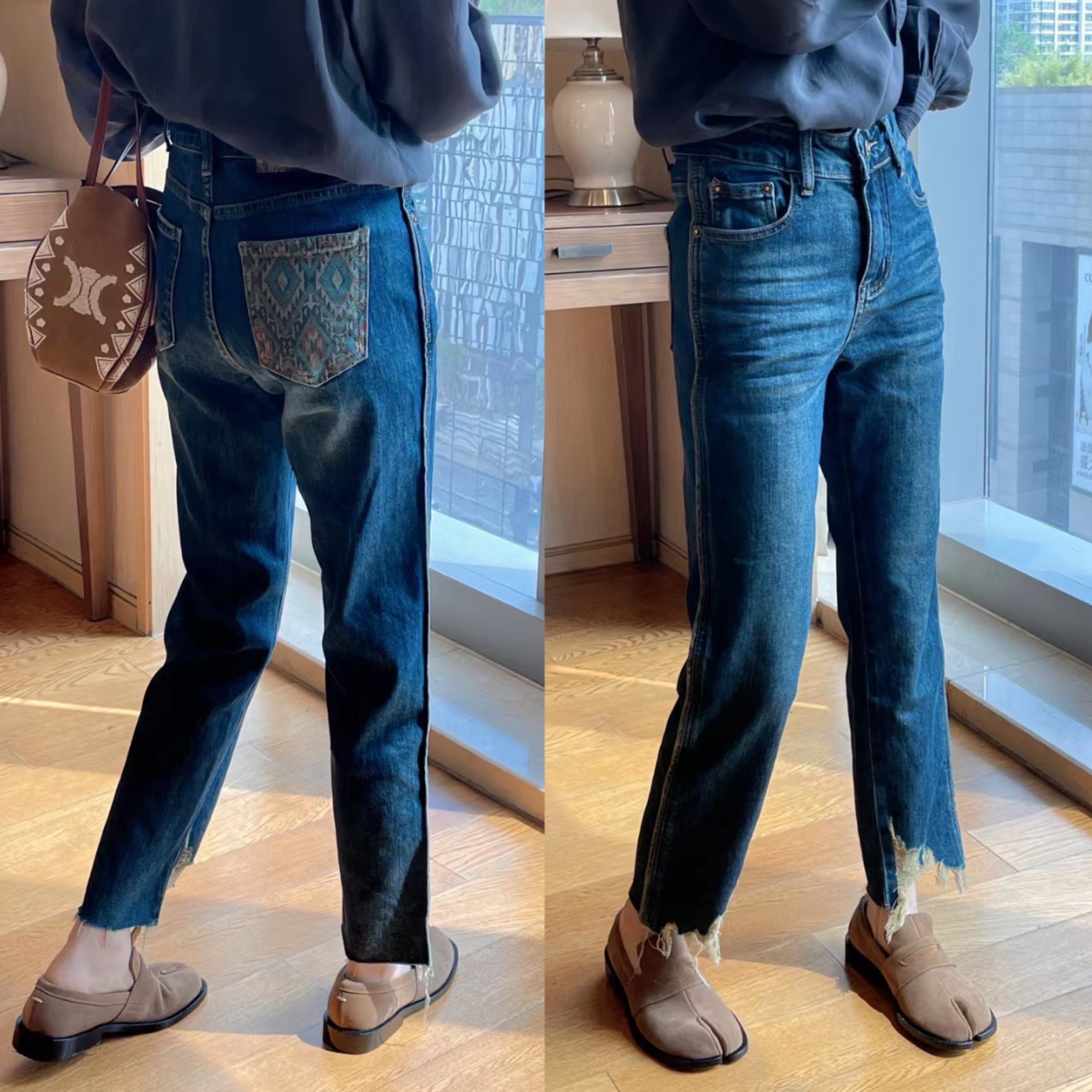 DearGod正韓女裝歐洲站2022秋季高腰正韓口袋復古菱格印花小直筒毛邊九分牛仔褲潮
