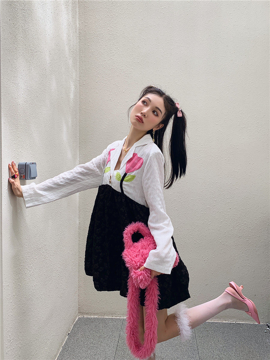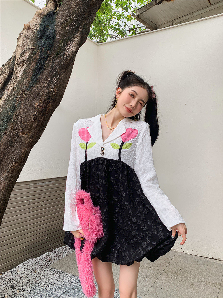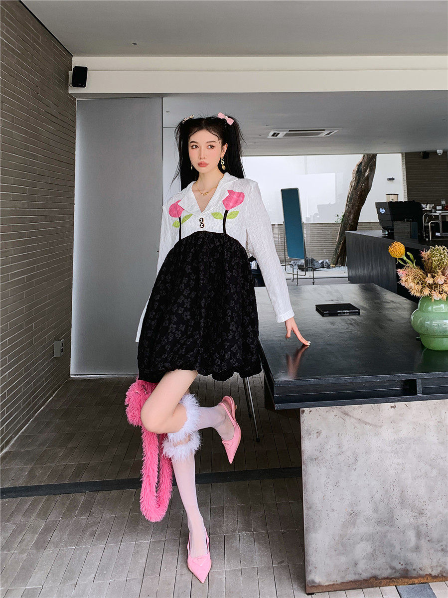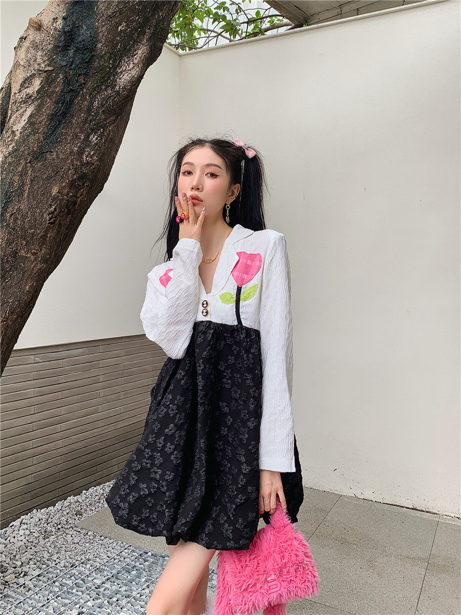 DearGod正韓女裝小眾減齡大擺花苞裙女裝秋季復古法式拼接撞色貼布花朵提花連衣裙