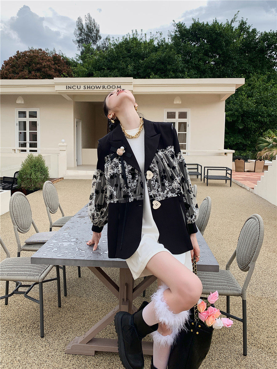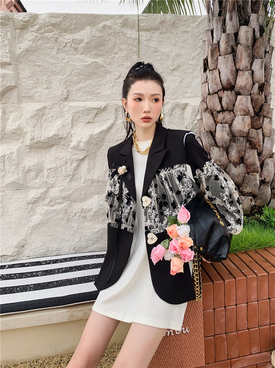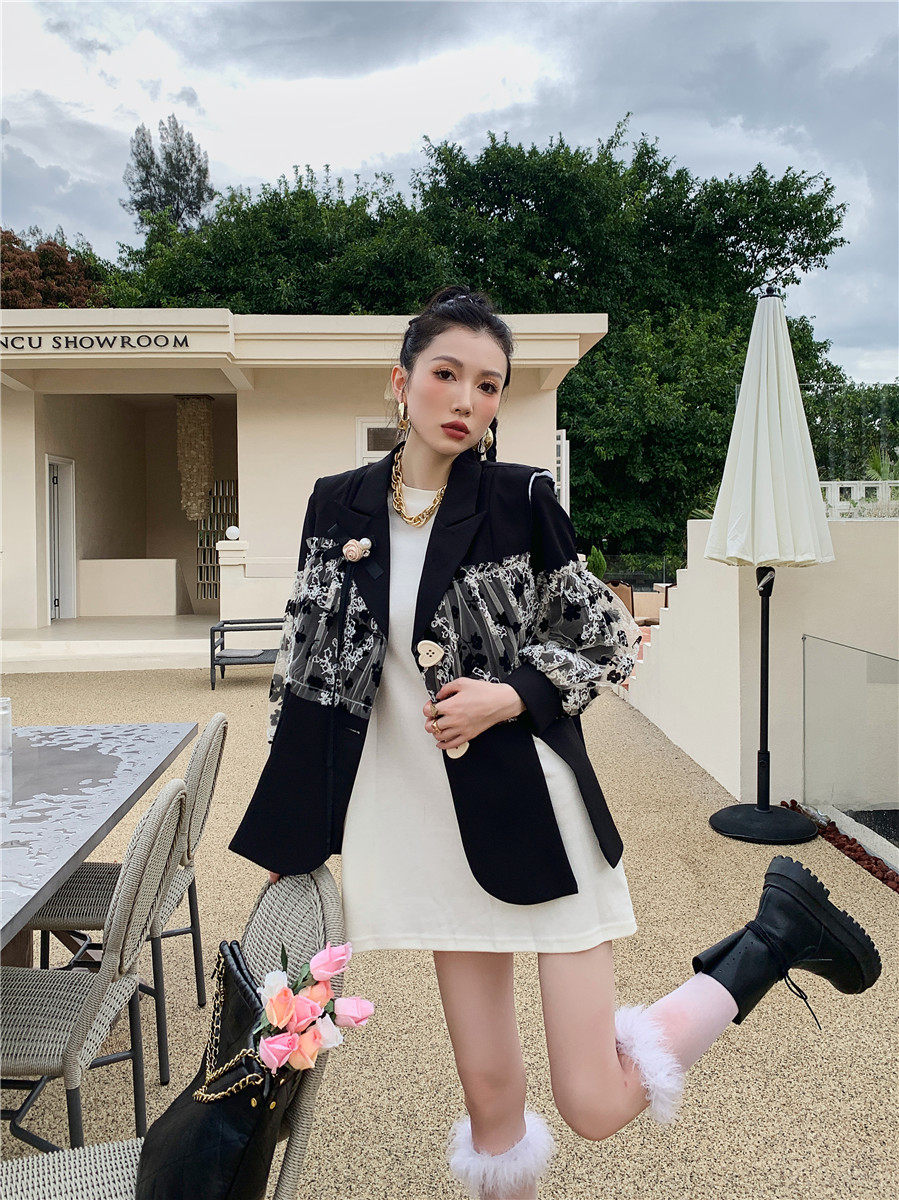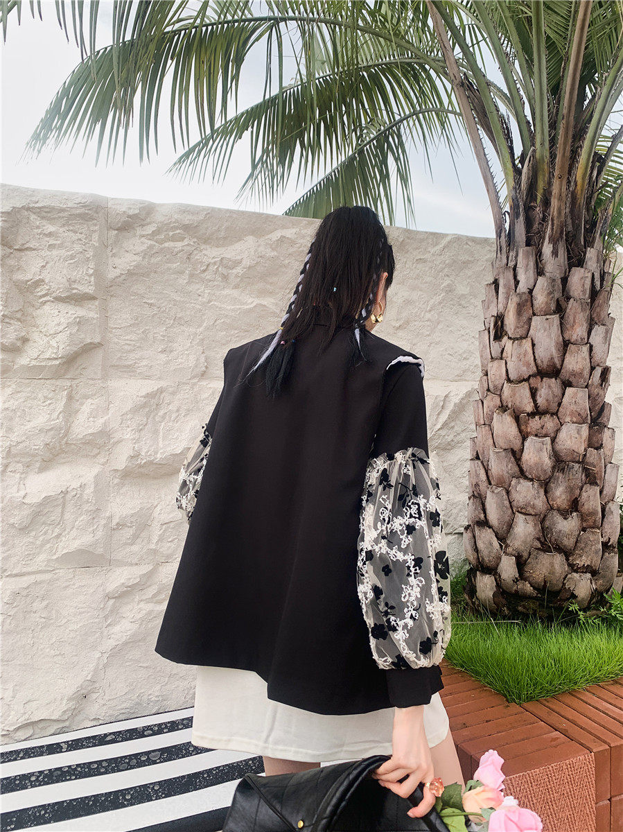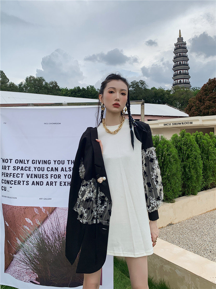 DearGod正韓女裝法式設計感蕾絲繡花黑色西裝馬甲外套女秋圓領白色燈籠袖衛衣裙子洋裝