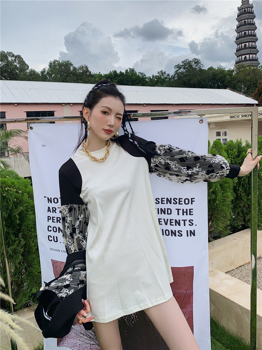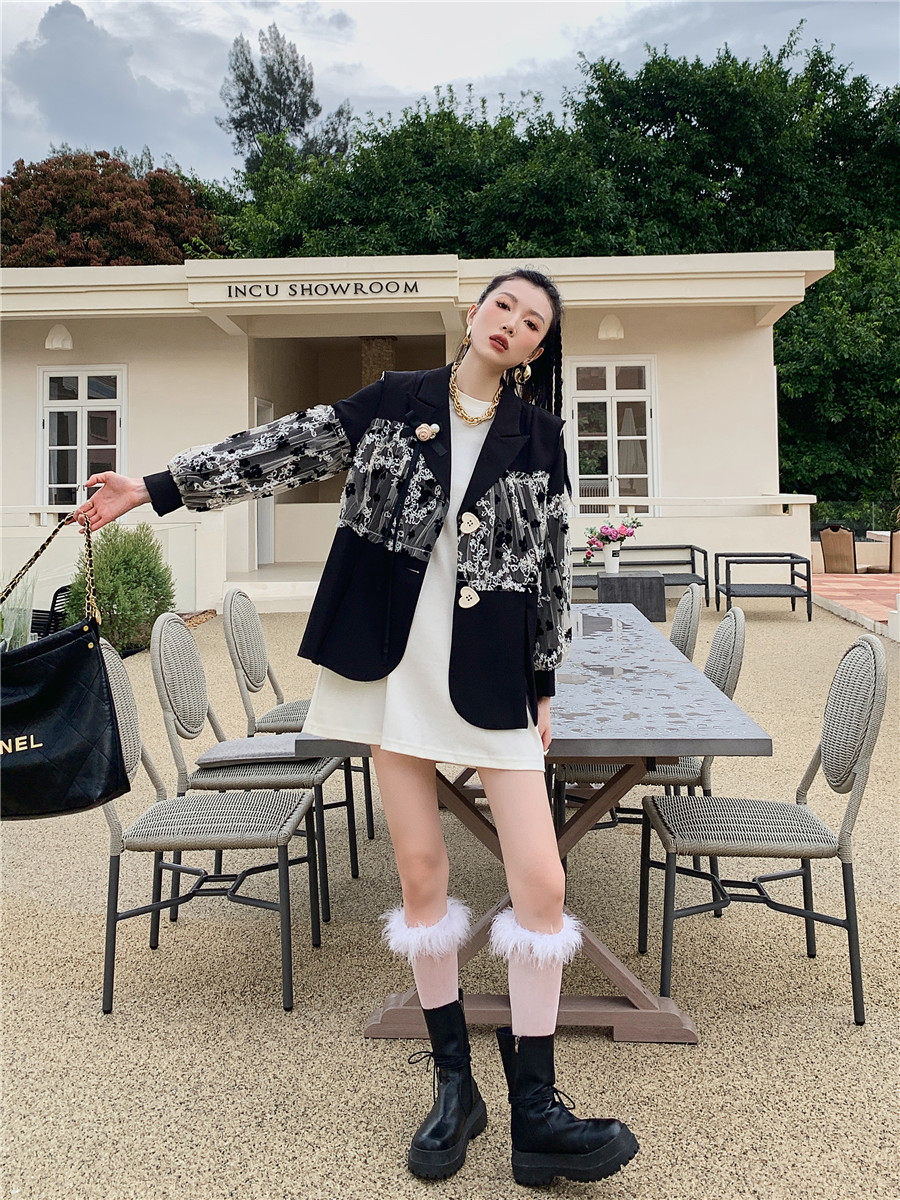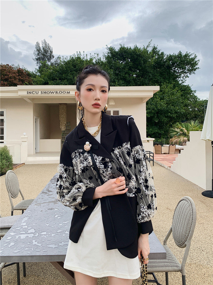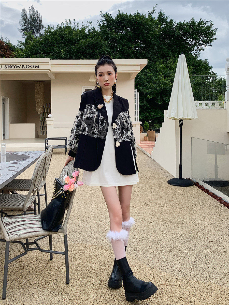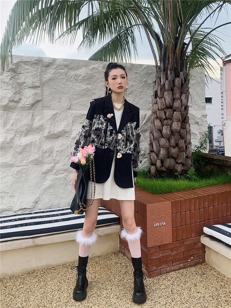 DearGod正韓女裝法式設計感蕾絲繡花黑色西裝馬甲外套女秋圓領白色燈籠袖衛衣裙子洋裝